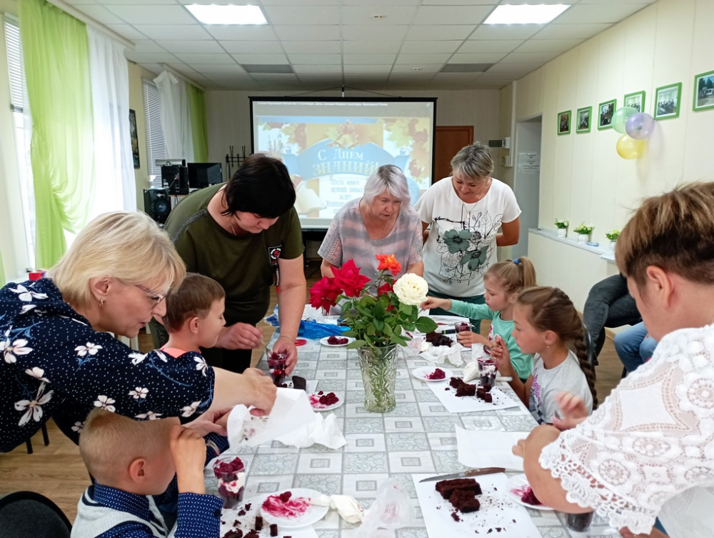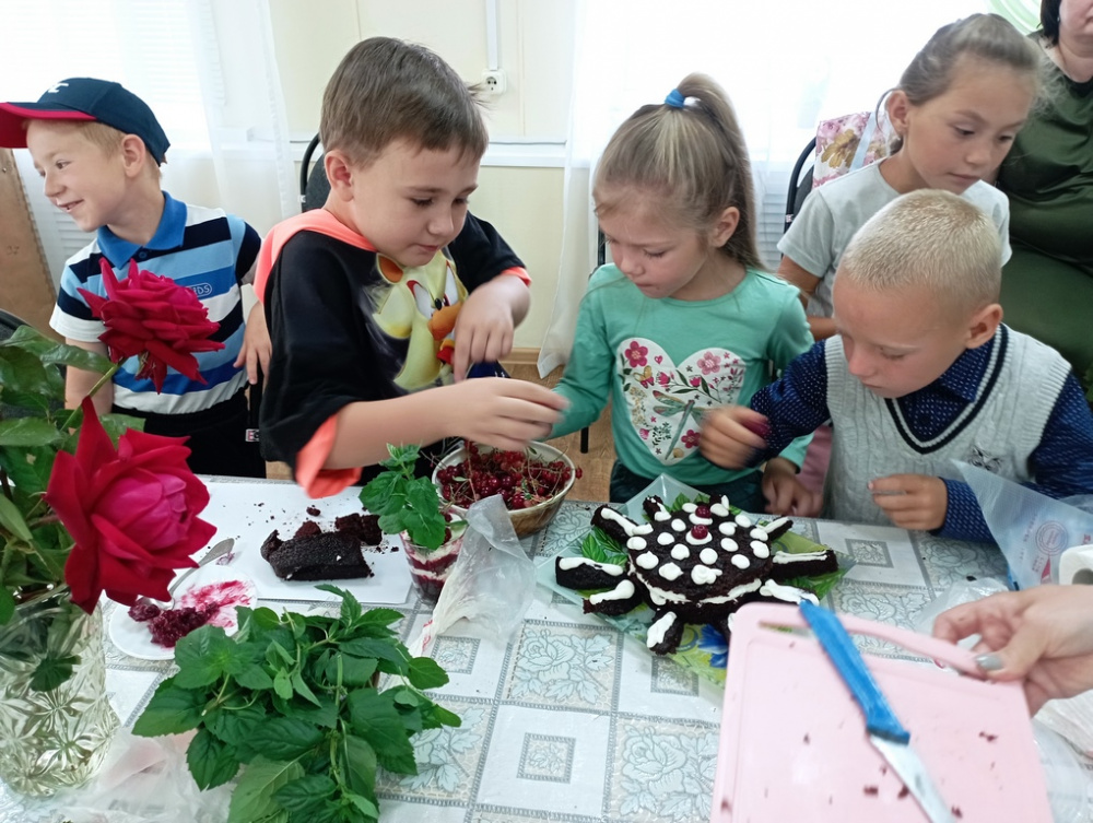 Программа мероприятия была очень разнообразной. Дети с родителями дружно отгадывали загадки о школе и школьных принадлежностях, собирали портфели в школу, вспомнили правила дорожного движения, провели физкультминутку и простились с игрушками, которые теперь будут развлекать младших детей - детсадовцев. А игрушки подготовили для детей правила, которые помогут детям быстрее привыкнуть к школьной жизни. Но самым запоминающимся моментом праздника стал урок (мастер-класс), который провела для ребят серебряный волонтёр, социальный работник Елена Дмитриевна Елистратова. Она научила детей готовить трайфлы. С умилением и восторгом наблюдали родители и сотрудники КЦСОН за ребятами, которые во время импровизированного урока готовили САМИ! вкусное угощение. И пусть кого –то не очень слушался нож, а у кого – то не сразу получилось отсаживать крем из кондитерского мешка, зато сколько гордости было за самостоятельно приготовленные вкусняшки! А потом все вместе соорудили торт в форме солнышка, каждый по очереди внёс свою лепту в общее дело: вырезал лучи из бисквита, смазывал вишнёвым конфитюром заготовки, украшая ягодами и листочками мяты.