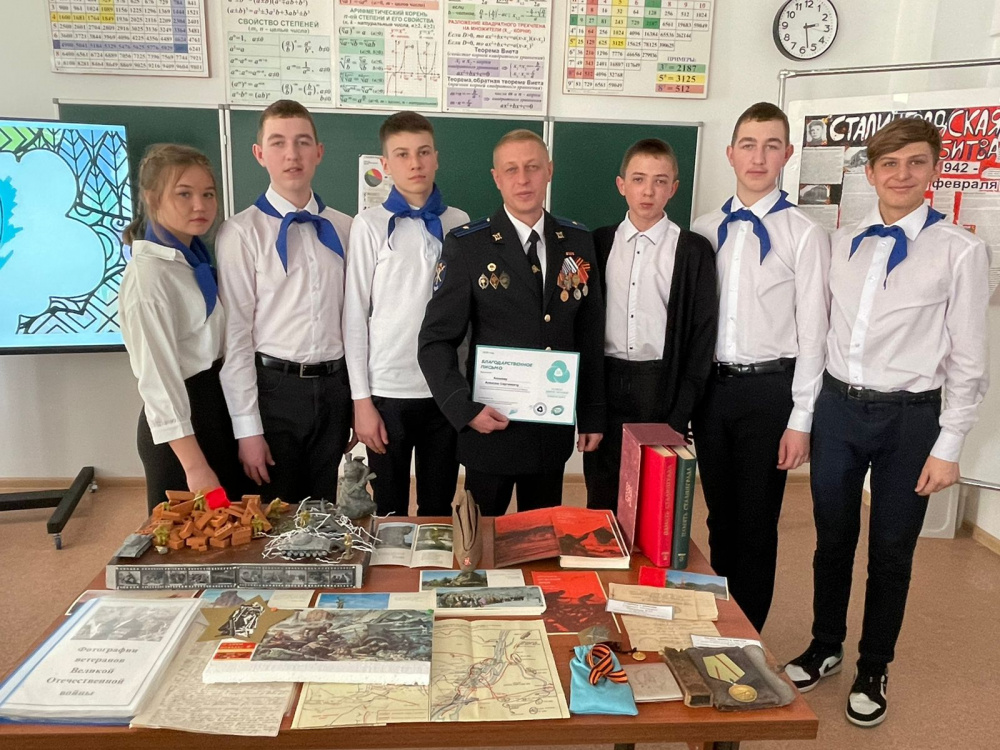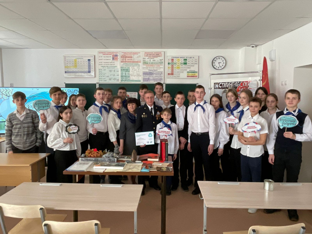 С целью патриотического воспитания подрастающего поколения, сохранения культурно-нравственных и исторических ценностей Алексей Сергеевич рассказал школьникам 8 «А» класса, о легендарном подвиге 10-й стрелковой дивизии внутренних войск НКВД СССР - единственной из всех соединений Сталинградской битвы удостоенной «Ордена Ленина», сотни бойцов которой награждены орденами и медалями, а 20 чекистов дивизии удостоены звания Героя Советского Союза, пять человек стали кавалерами орденов Славы всех трёх степеней.