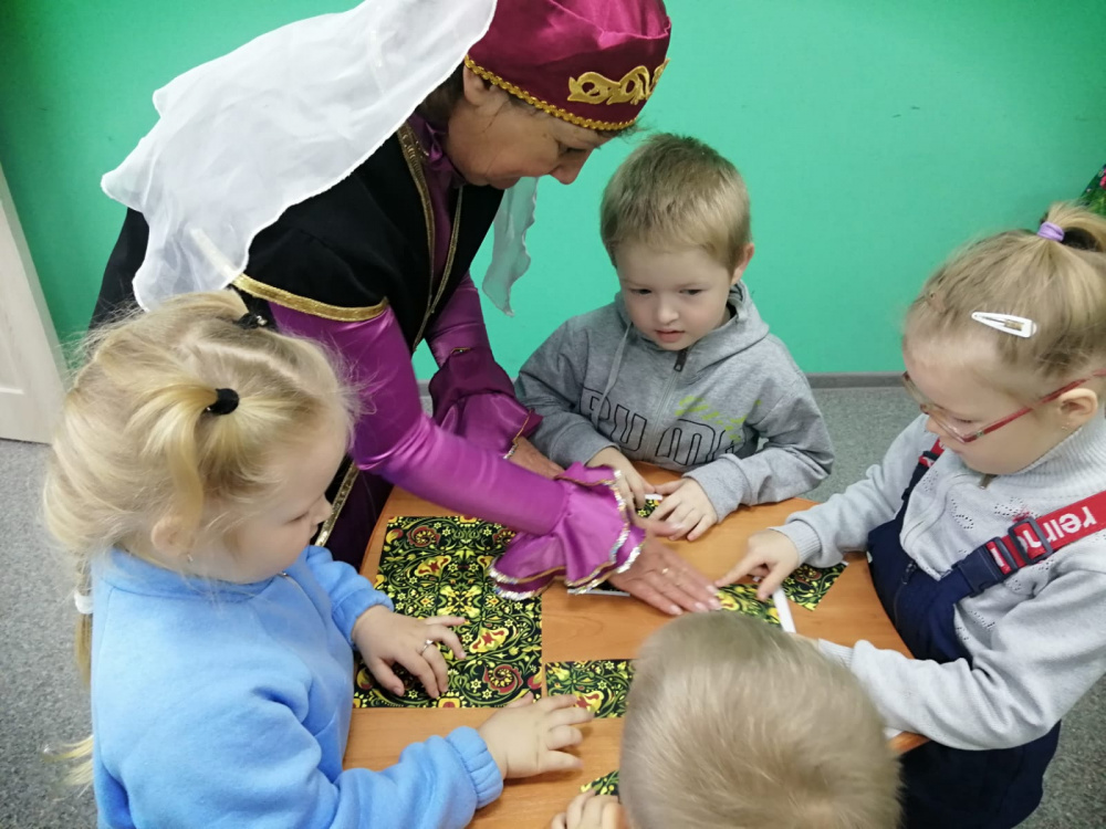 Затем ребятам рассказали и показали, как выглядит татарская национальная одежда мужчин и женщин, ребята услышали татарские названия некоторых вещей, с удовольствием повторяли незнакомые слова.