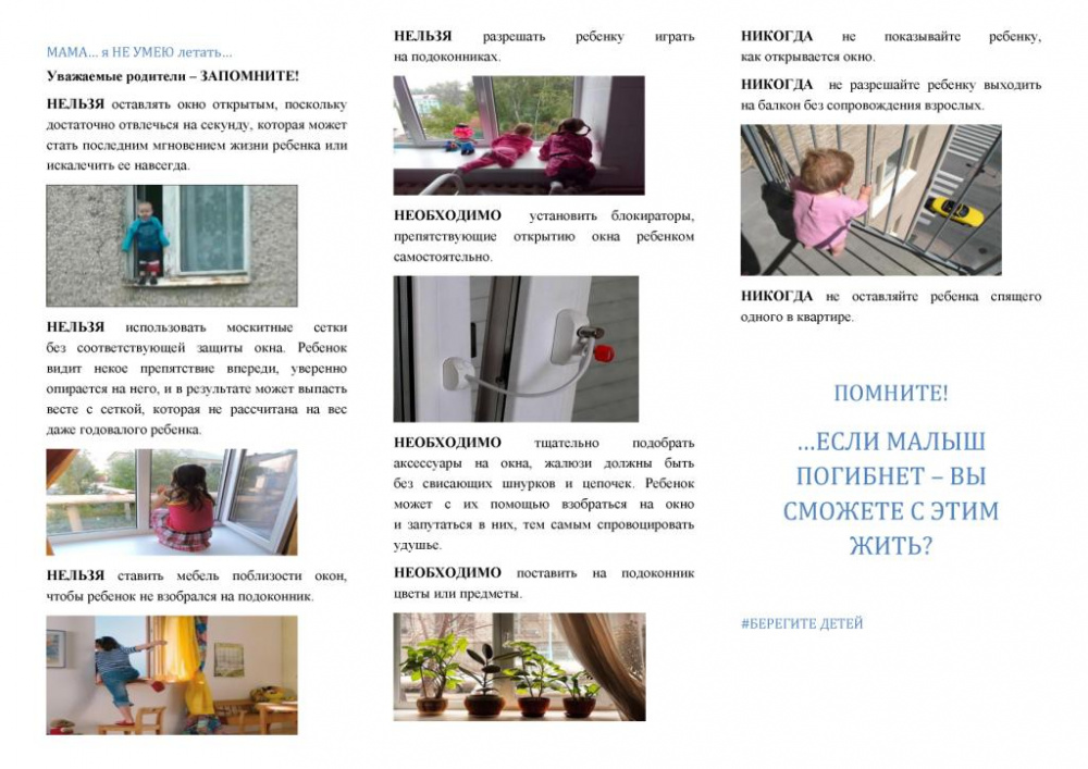 Ежегодно с началом весенне-летнего сезона регистрируются случаи гибели детей при выпадении из окон. В целях предупреждения несчастных случаев Межведомственная комиссия по делам несовершеннолетних и защите их прав при правительстве Челябинской области утвердила Положение "О проведении областного межведомственного профилактического мероприятия "Безопасное окно", так же были разработаны следующие методические материалы в виде брошюры.