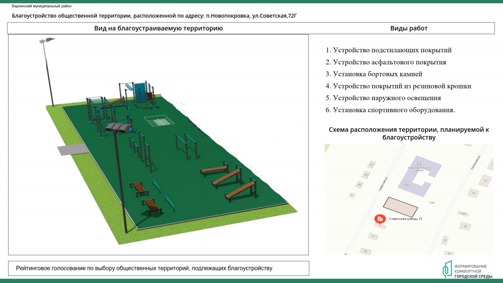 Благоустройство общественной территории, расположенной по адресу п. Новопокровка, ул. Советская, 72Г;