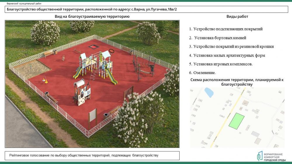 Благоустройство общественной территории, расположенной по адресу, с. Варна, ул. Пугачёва, 18а2;