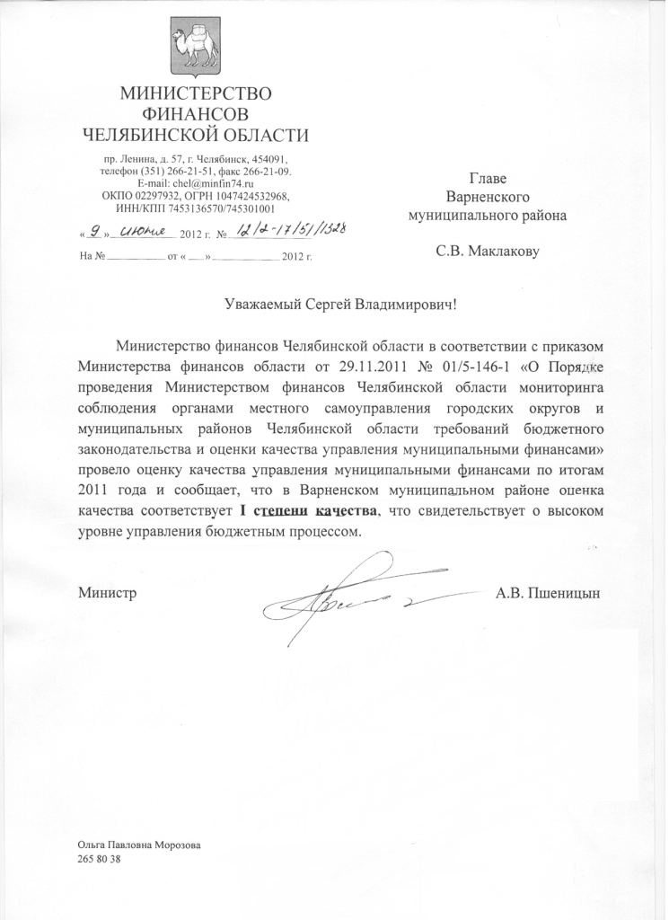 Министерство финансов Челябинской области в соответствии с приказом Министерства финансов области от 29.11.2011 № 01/5-146-1 «О Порядке проведения Министерством финансов Челябинской области мониторинга соблюдения органами местного самоуправления городских округов и муниципальных районов Челябинской области требований бюджетного законодательства и оценки качества управления муниципальными финансами» провело оценку качества управления муниципальными финансами по итогам 2011 года и сообщает, что в Варненском муниципальном районе оценка качества соответствует I степени качества, что свидетельствует о высоком уровне управления бюджетным процессом.