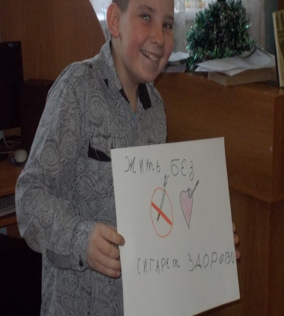 Ребятами были нарисованы плакаты с антитабачной рекламой и разыграны две сценки уверенного отказа от курения. В завершение каждый ученик заполнил бланк анкеты, получил буклет «Наша цель – быть здоровым» и закладки, где чемпионы России призывают к здоровому образу жизни.