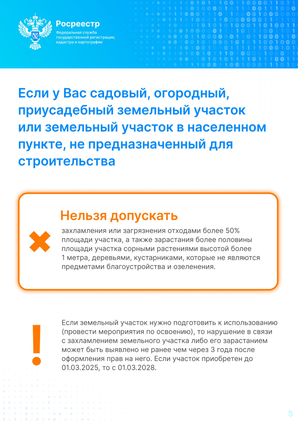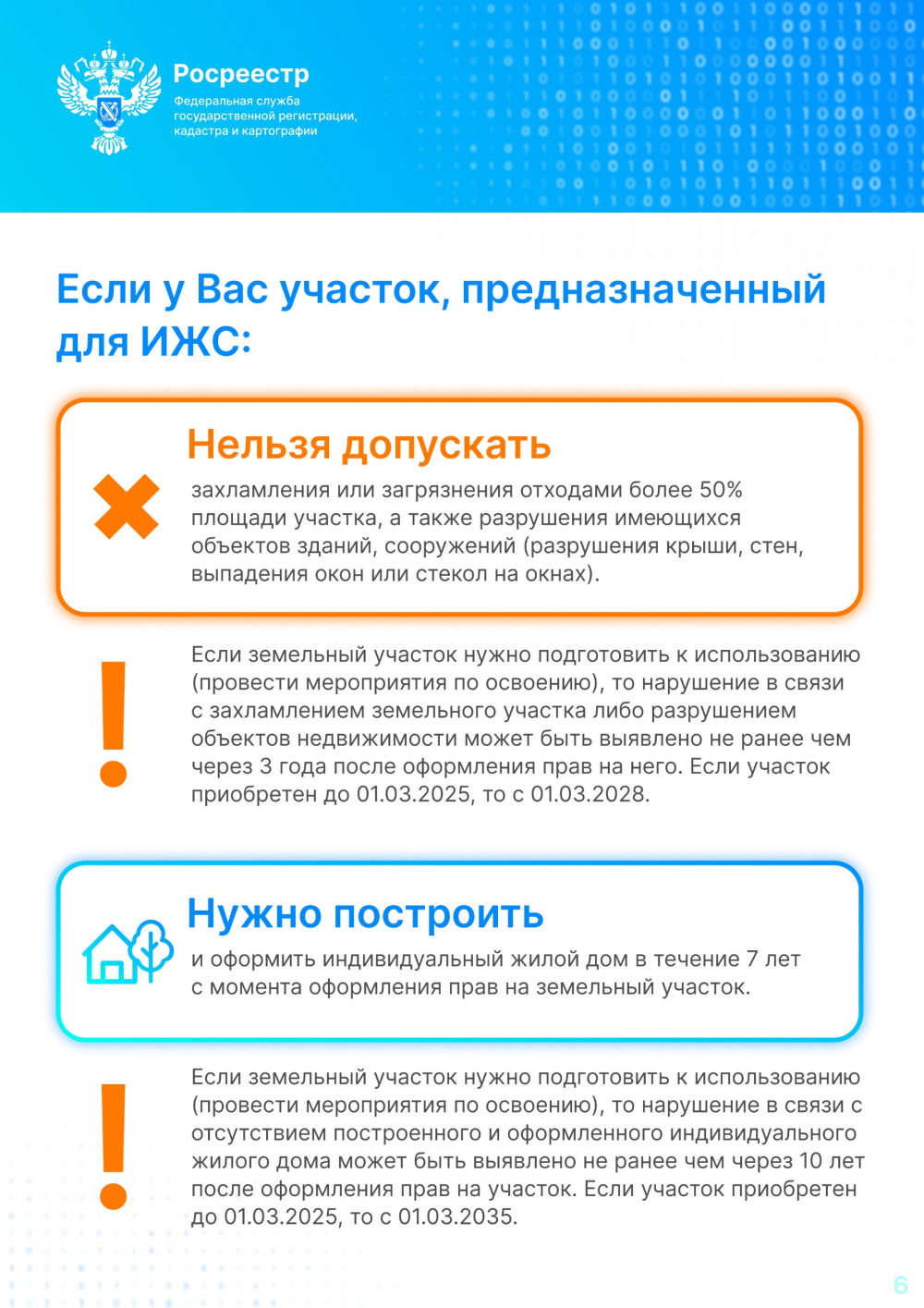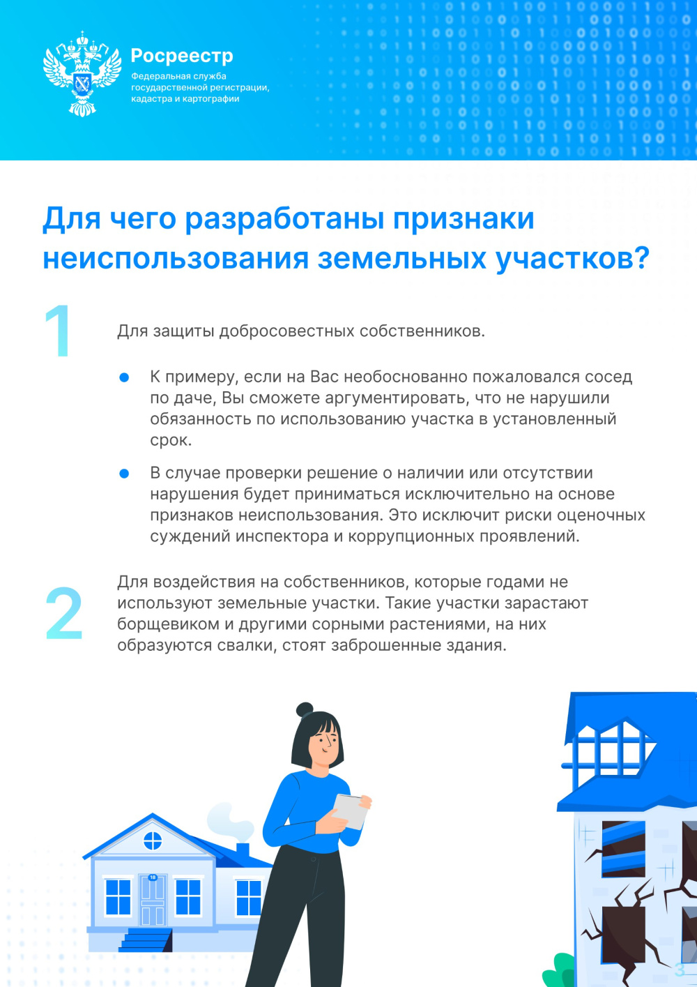 Росреестр разработал методическое пособие (https://rosreestr.gov.ru/upload/Doc/press/Признаки_неиспользования_земельных_участков.pdf) для граждан в связи с началом применения с 1 сентября 2025 года признаков неиспользования земельных участков в населённых пунктах, садовых и огородных участков. В нём в простой и доступной форме рассказывается, о каких признаках идёт речь и что делать собственникам, чтобы не допустить нарушений.
