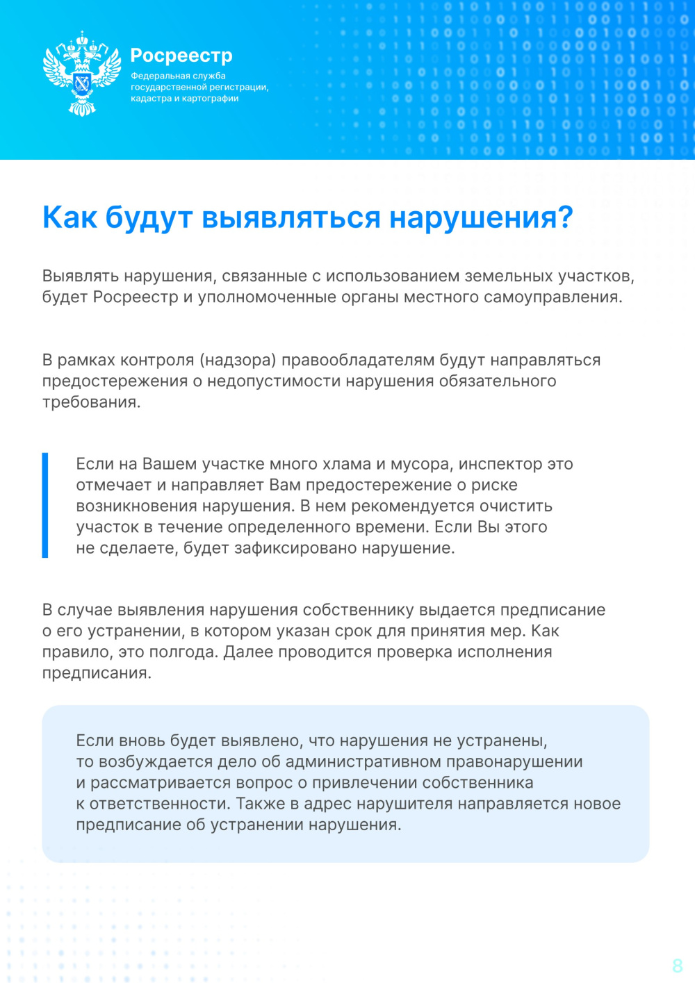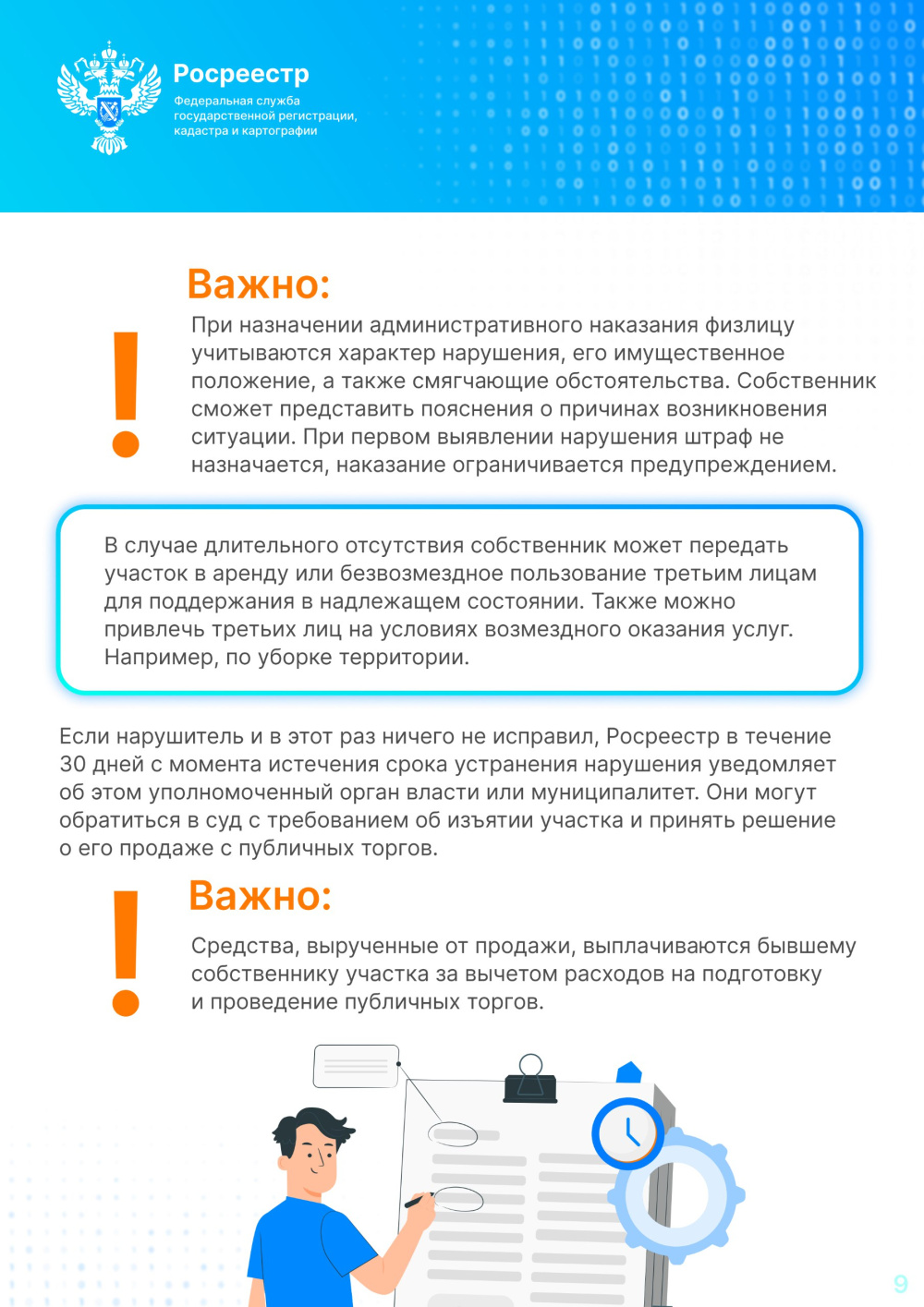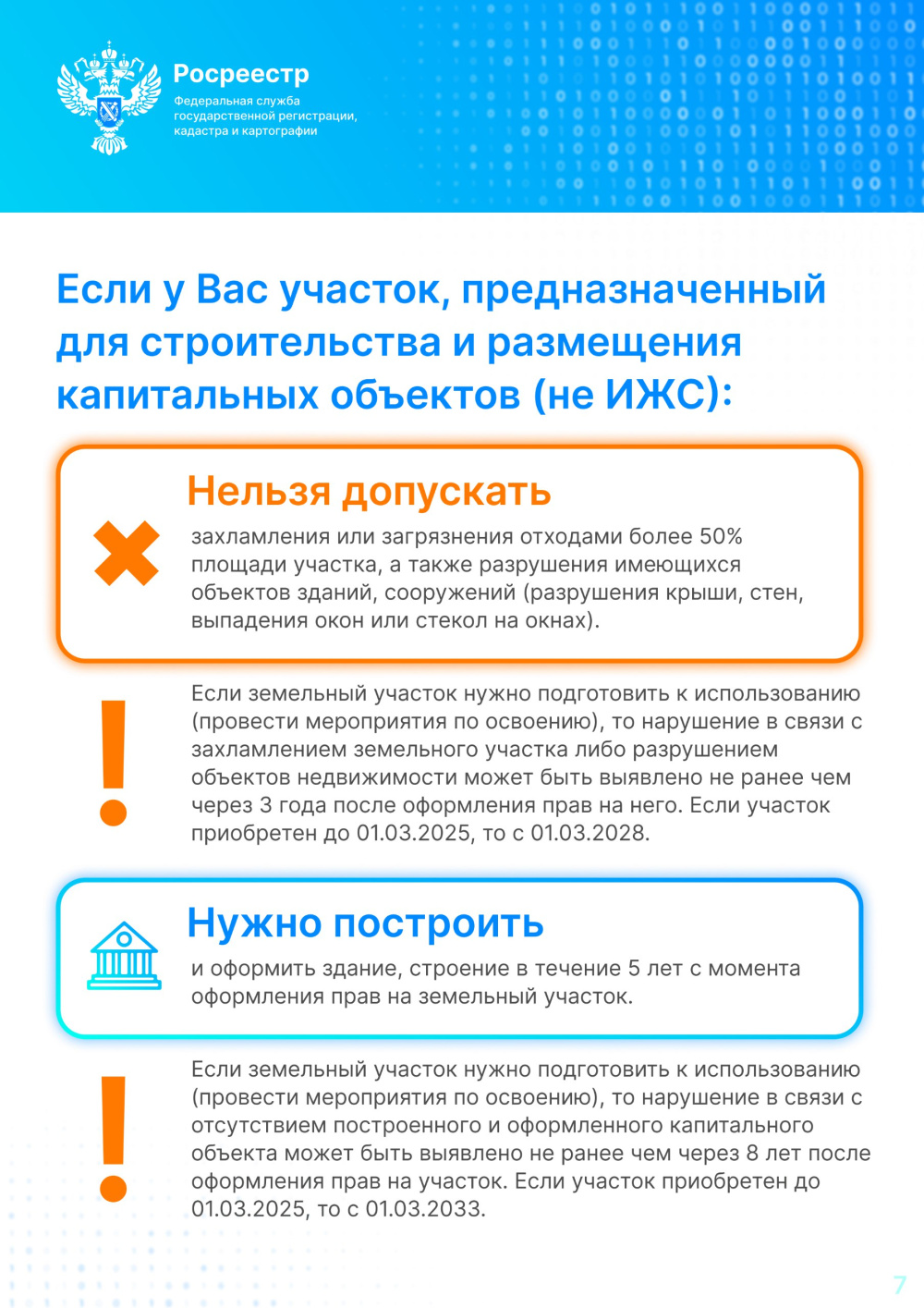 Росреестр разработал методическое пособие (https://rosreestr.gov.ru/upload/Doc/press/Признаки_неиспользования_земельных_участков.pdf) для граждан в связи с началом применения с 1 сентября 2025 года признаков неиспользования земельных участков в населённых пунктах, садовых и огородных участков. В нём в простой и доступной форме рассказывается, о каких признаках идёт речь и что делать собственникам, чтобы не допустить нарушений.