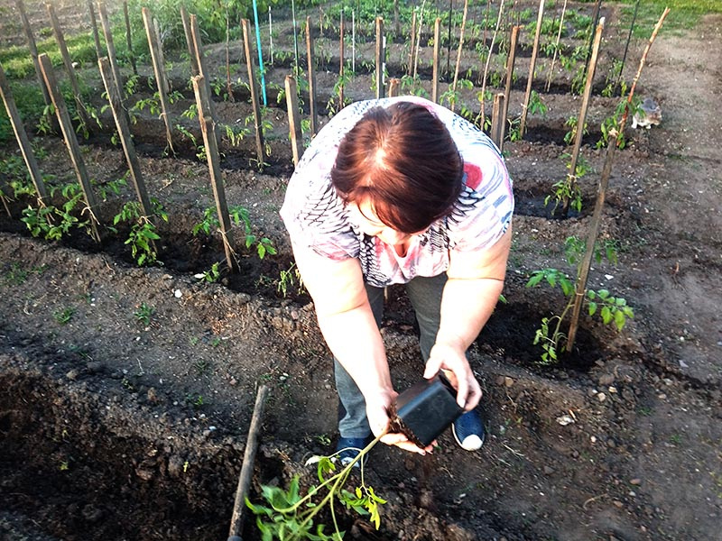 Вариант 2. Посадка рассадой в открытый грунт. Перед высадкой растения предварительно «закаливают». Для этого ящики с рассадой ежедневно в течение 15–20 дней выносят на улицу на определенное время (от 2 до 10 часов). Непосредственно перед посадкой рекомендуется обильно пролить водой лунку, аккуратно расправить корешки рассады, стараясь не повредить корневую систему, и засыпать землей. Томат еще раз полить, можно сразу подвязать его к колышку, чтобы стебель не сломался от ветра. Уход включает в себя: полив, подкормку, рыхление почвы, окучивание, формирование куста.