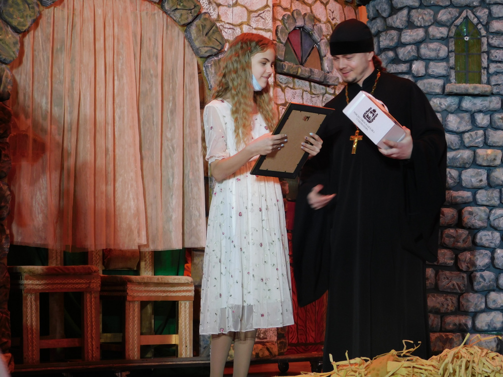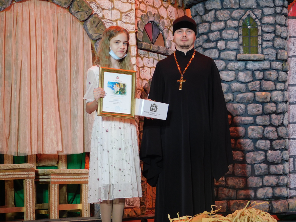 По традиции на Губернаторских ёлках награждают победителей регионального открытого конкурса литературных работ «Рождественская сказка». Аплодисментами приветствовали победителя ученицу МОУ «Гимназия им. К. Орфа» Шпиталенко Алису.