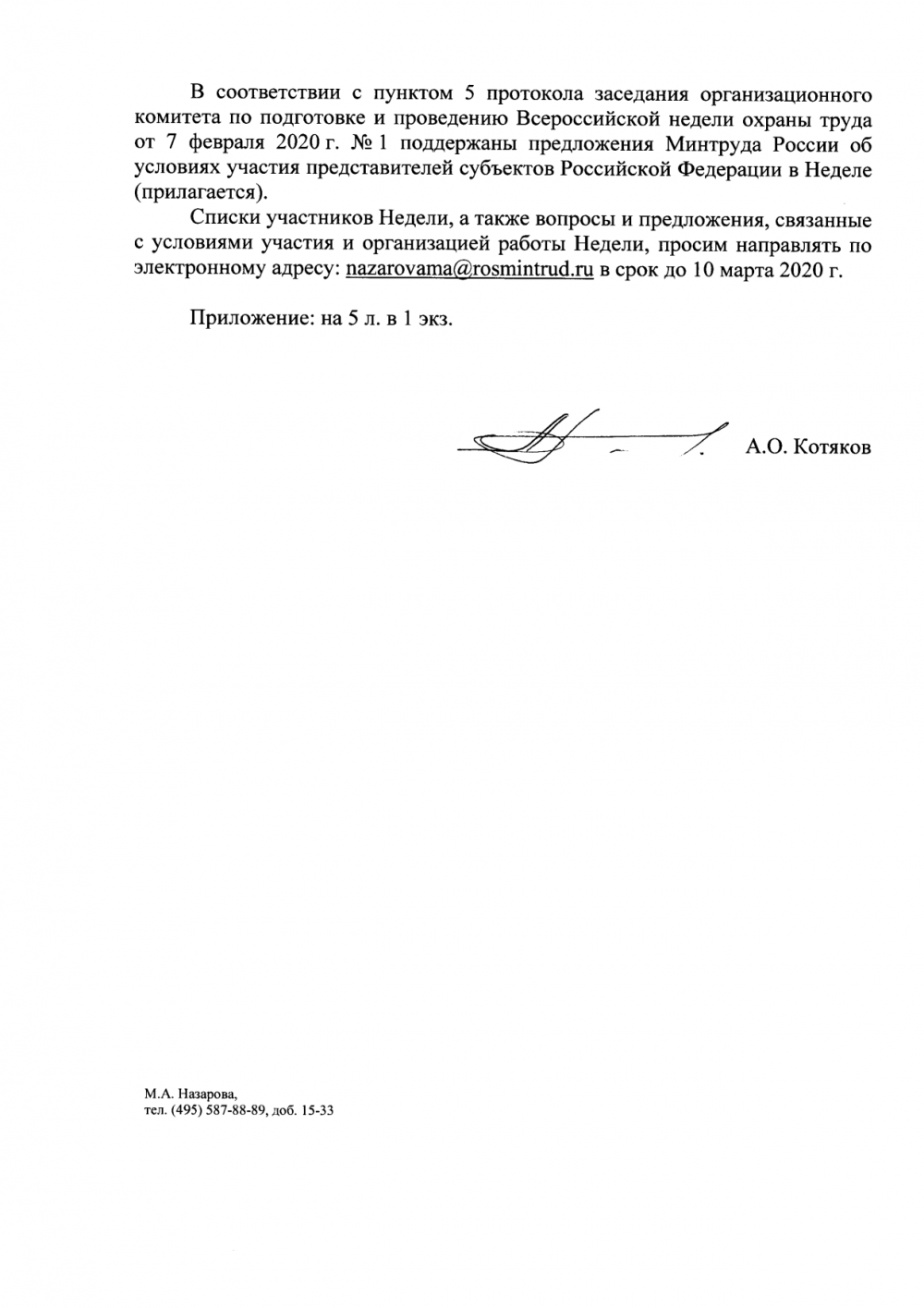 Списки участников, а также вопросы и предложения, связанные с условиями участия и организацией VI Всероссийской недели охраны труда, просим направлять по электронному адресу: nazarovama@rosmintrud.ru в срок до 10 марта 2020 г.