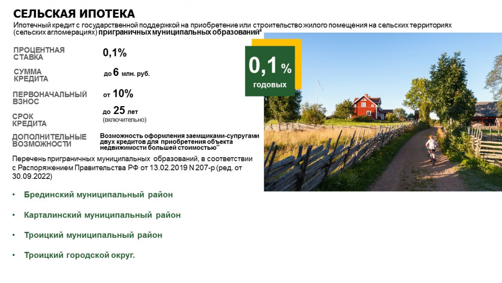 3)снижена процентная ставка до 0,1% годовых для Брединского, Карталинского, Троицкого муниципальных районов Челябинской области.