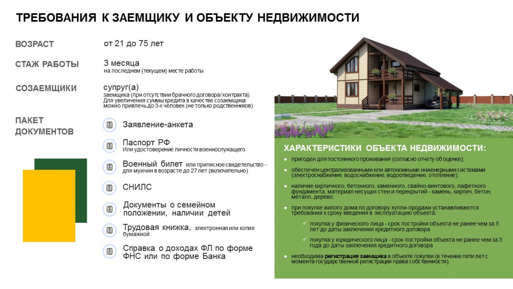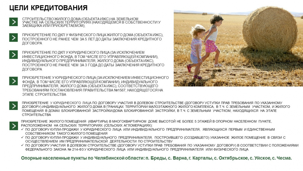 -Цель кредита: строительство нового жилого дома силами аккредитованного застройщика, покупка готового жилого дома не старше 5 лет, и новая цель - покупка квартиры в новостройке в опорном населенном пункте.