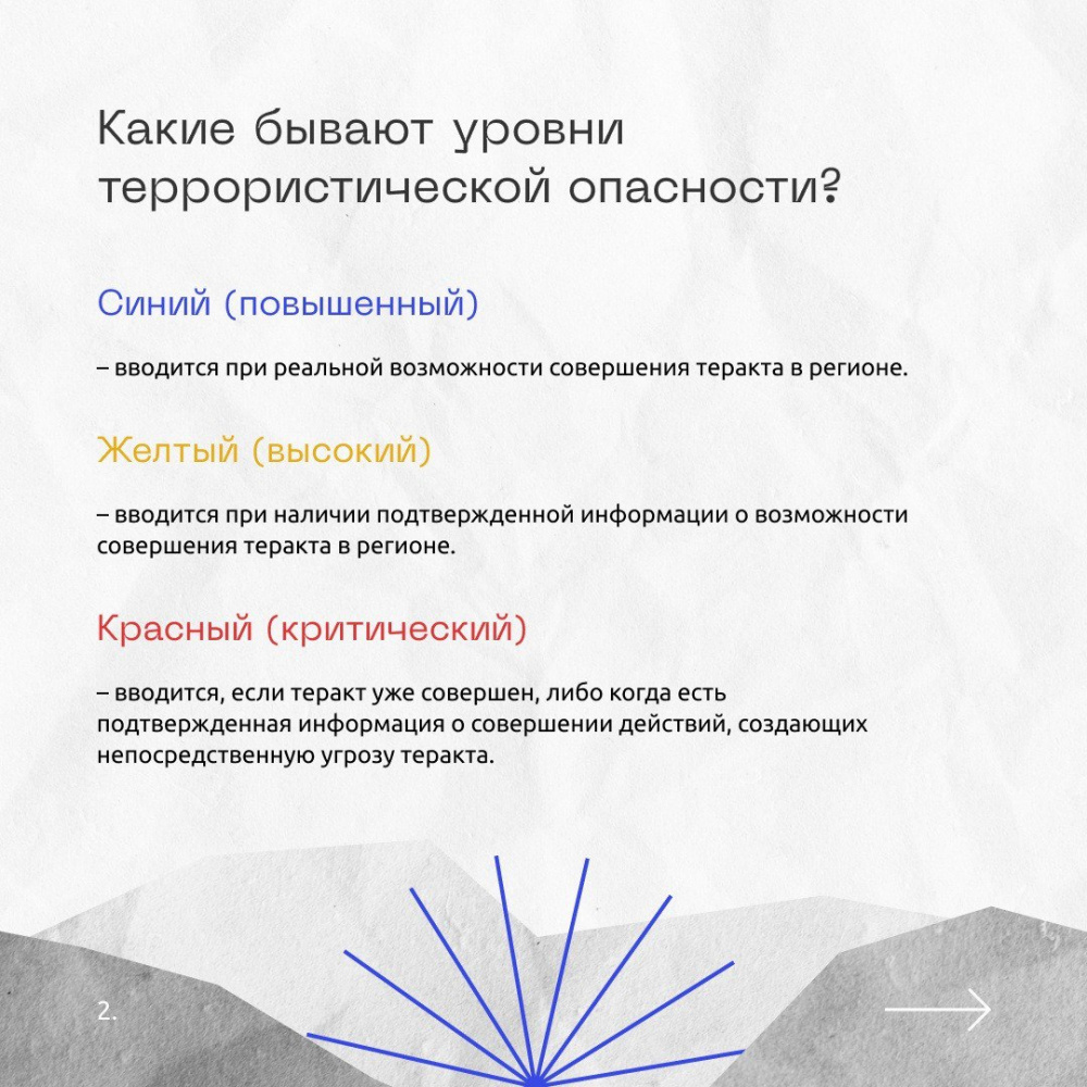 В шести регионах России был объявлен «желтый» уровень террористической опасности. Что означают синий, желтый и красный уровни и как это может повлиять на жителей регионов – смотрите в подготовленных карточках.