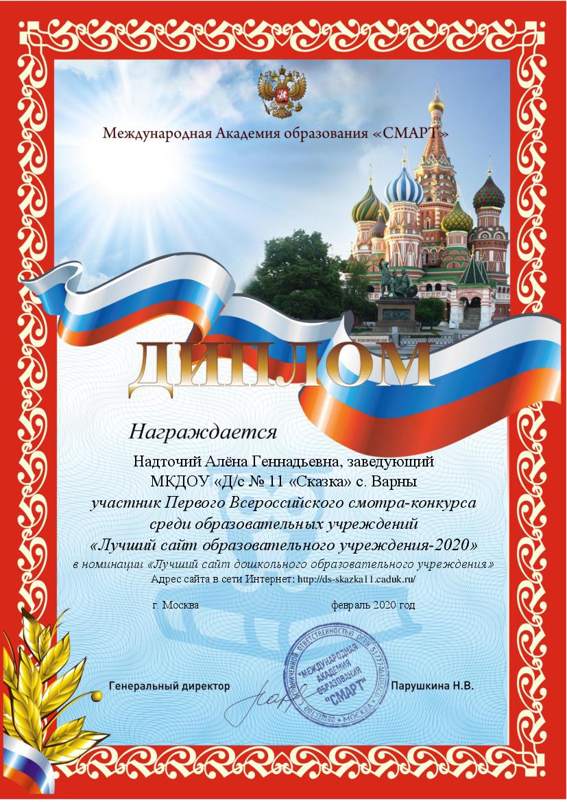 В феврале 2020 г. детский сад «Сказка» принял участие в Первом Всероссийском смотре-конкурсе среди образовательных учреждений «Лучший сайт образовательного учреждения-2020», организованный Международной Академией образования «Смарт».
