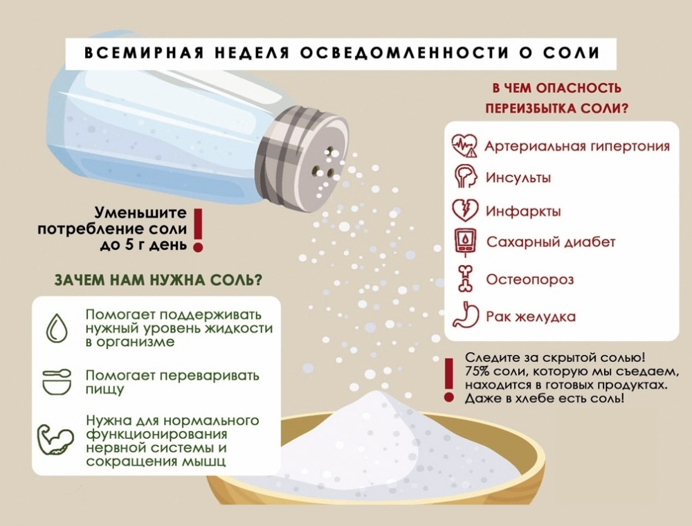 Важно помнить, что до 80% соли, потребляемой ежедневно, приходится на «скрытую соль». Например, большое количество соли содержится в мясе, рыбе и яйцах. Мясные блюда, приготовленные без соли, уже содержат ее в объеме 3–4 г. В сосисках и колбасах – около 1 г. соли на каждые 100 г. продукта. Примерно такое же количество в 100 г. майонеза, а в соусах на его основе может быть больше. В сырах содержится до 2 г. соли на 100 г.продукта.