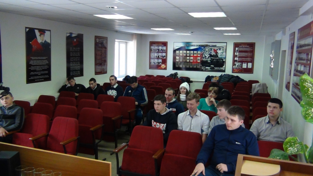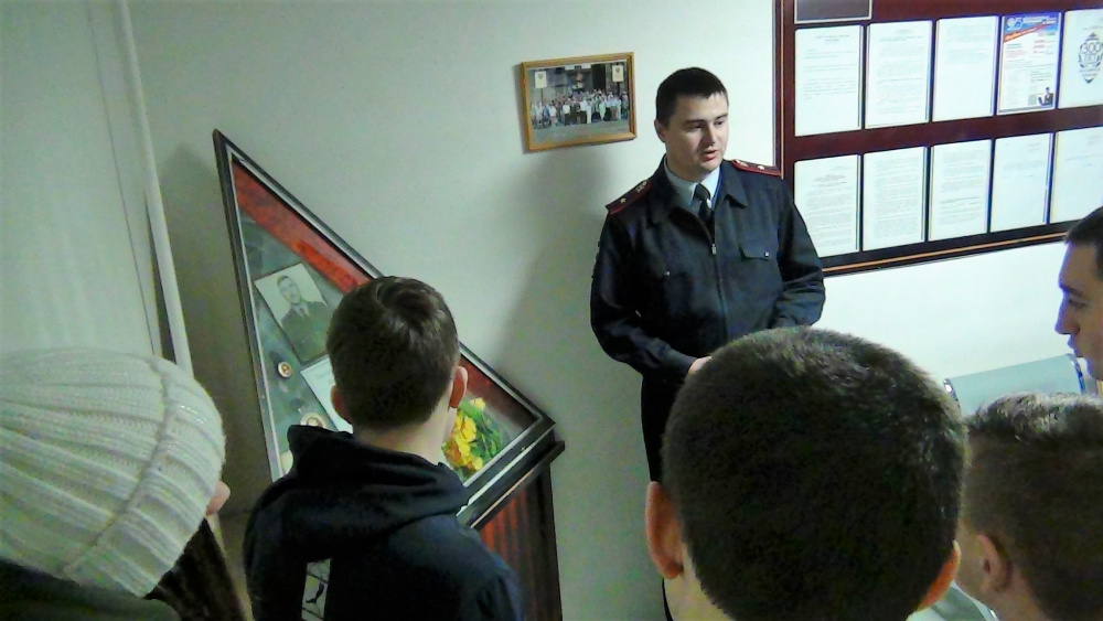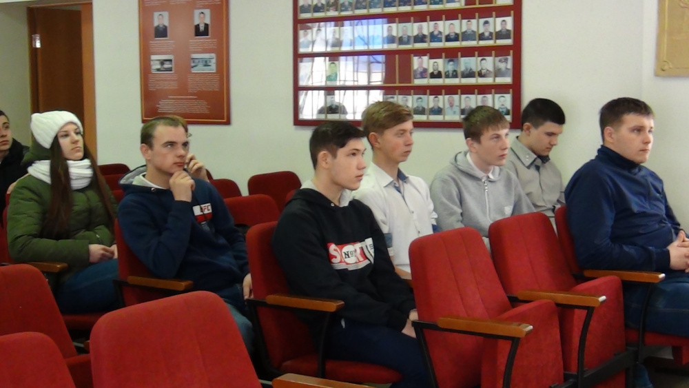 Затем в актовом зале отдела, ребятам рассказали историю отдела полиции, о службе в органах внутренних дел, о трудных, но интересных полицейских буднях. Студенты с интересом смотрели фотографии и награды за спортивные достижения, портреты ветеранов МВД и участников боевых действий.