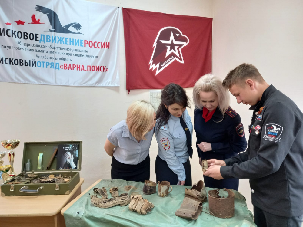 Воспитанник отряда Григорий Акиньшин, который уже не один раз участвовал в поисково-разведывательных экспедициях, ознакомил полицейских с собранными экспонатами Великой Отечественной войны. Наибольший интерес у посетителей музея вызвали пуля, застрявшая в разбитой рации, патрон противотанкового ружья и смертный медальон (личный опознавательный знак) солдата Советской Армии. Также поисковик рассказал о деятельности отряда, работе с архивами, картами, участии в туристических походах и слетах, поисковых мероприятиях, регионального и всероссийского уровня. Собранные материалы музея и рассказ о деятельности поискового отряда, вызвали большой интерес у полицейских.