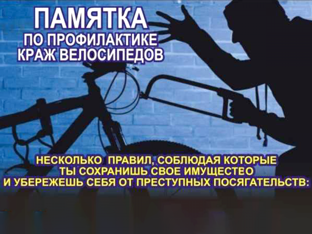 Если Вы стали очевидцем кражи велосипеда (мопеда) или являетесь потерпевшем, незамедлительно позвоните в полицию по телефонам дежурной части ОМВД России по Варненскому району:02 (с мобильного телефона 102), 8 (351 42) 2-10-05..