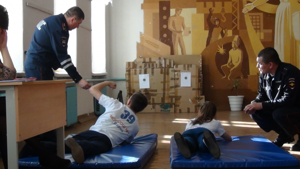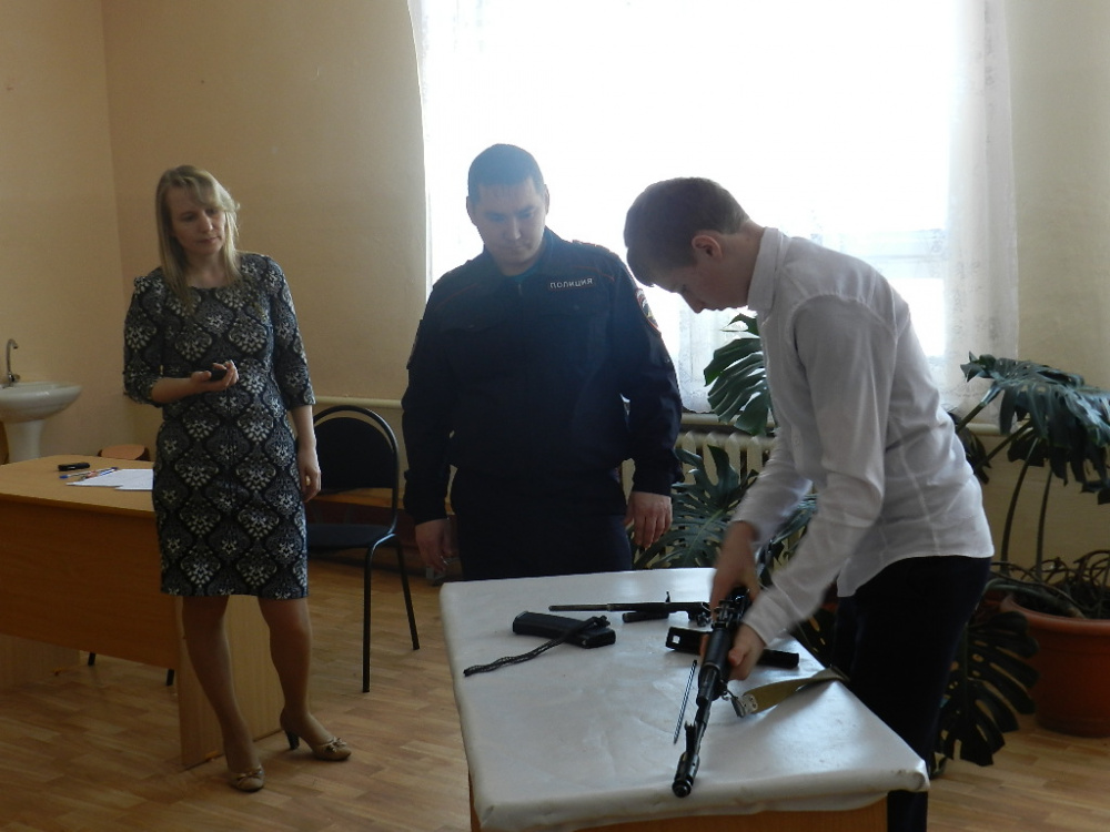 Затем инспектор направления профессиональной подготовки лейтенант внутренней службы Алексей Катрюк, ознакомил детей с оружием и специальными средствами защиты, находящимися на вооружении в системе МВД, рассказал о правилах применения средств защиты. Неподдельный интерес у ребят вызвала демонстрация вооружения, в ходе проведения мероприятия мальчишки разбирали и собирали пистолет, надевали на себя бронежилет и каску. Девочки тоже с удовольствием примеряли средства защиты и пробовали разобрать табельное оружие. По завершении «Урока мужества» была организована фотосессия, в которой приняли участие все желающие.