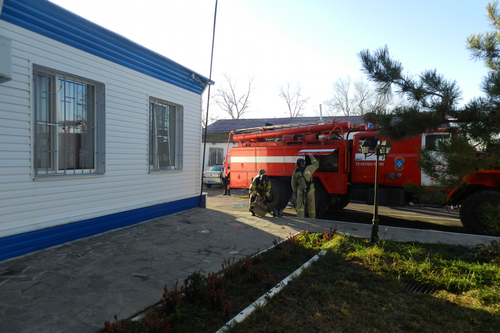 По тактическому замыслу учений, в результате короткого замыкания электропроводки в одном из кабинетов произошел пожар. При его обнаружении сработала пожарная сигнализация. Дежурный объявил тревогу, сообщил о пожаре в пожарную часть и приступил к эвакуации личного состава, материальных ценностей и посетителей отдела. С административного здания все присутствующие в течение трех-четырех минут вышли на улицу.
