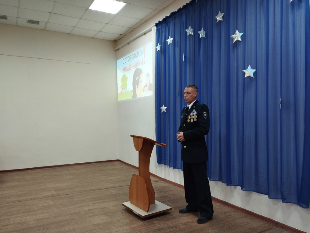 Председатель Совета ветеранов ОМВД майор юстиции в отставке Алексей Коннов проинформировал присутствующих о наиболее распространённых схемах, которые используют мошенники, желая завладеть имуществом граждан, акцентировал особое внимание на том, что сотрудники правоохранительных органов, как и сотрудники банка, никогда не звонят своим клиентам с рекомендациями, какие действия им нужно выполнить, чтобы уберечь деньги от злоумышленников и призвал родителей не передавать свои личные данные, реквизиты банковских карт и пароли незнакомым людям, не переходить по ссылкам в сообщениях, а в случае утери карты блокировать счёт.