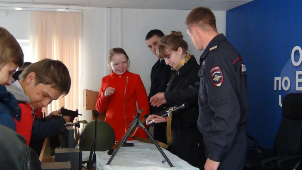Затем начальник по работе с личных составов майор внутренней службы Н.Н. Рыбаков рассказал детям о высших учебных заведениях системы МВД России, специальностях, порядке и требованиях, предъявляемых к желающим поступить в образовательные учреждения системы МВД России. Полицейские показали и рассказали об оружии, состоящем на вооружении в ОМВД.