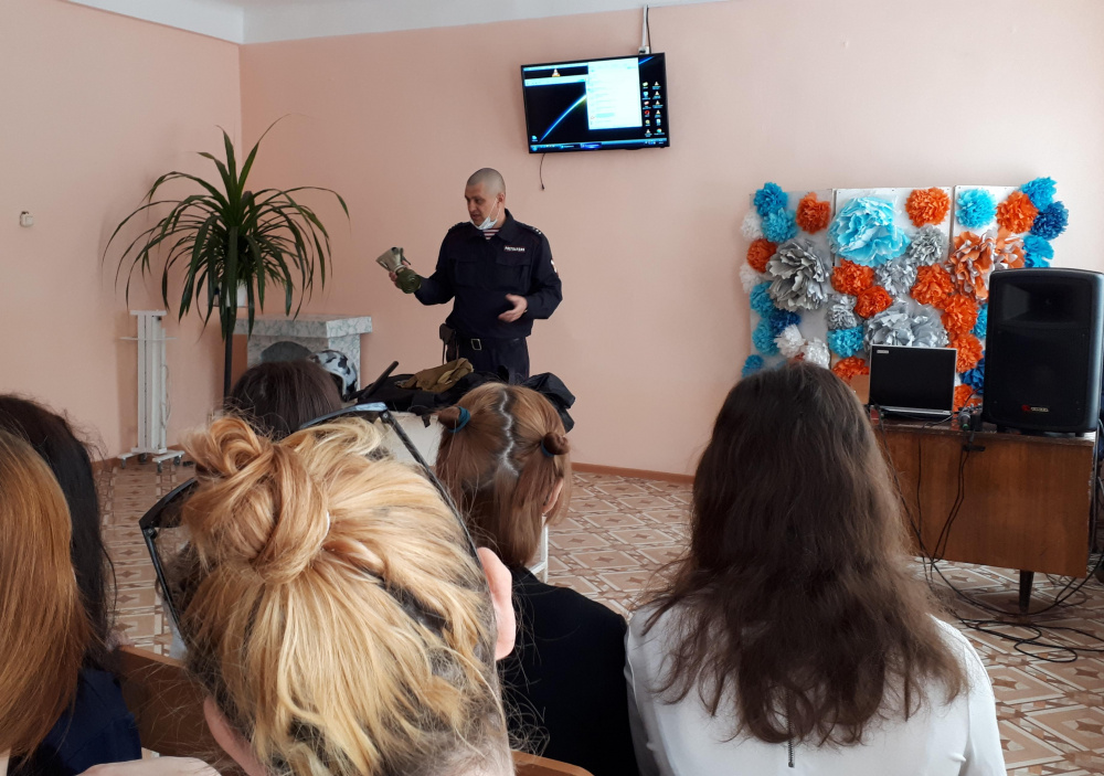 Командир отделения старший прапорщик полиции Романенков Евгений Иванович рассказал студентам о службе во вневедомственной охране, познакомил с вооружением, индивидуальными средствами защиты и активной обороны, пояснил, в каких случаях они применяются, какие характеристики имеют. Желающие примерили на себя бронежилет, каску, противогаз.