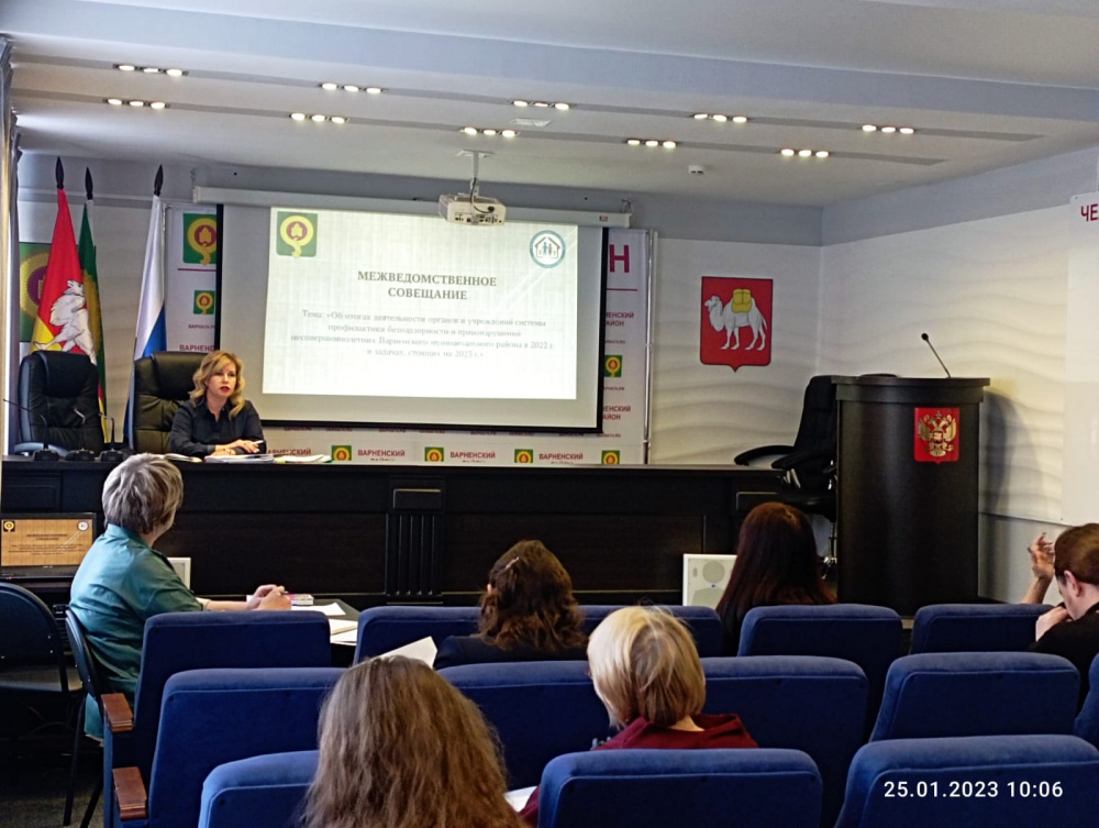 25 января заместителем главы Варненского муниципального района по социальным вопросам, председателем комиссии по делам несовершеннолетних и защите их прав администрации Варненского муниципального района О.В. Васичкиной, в целях реализации полномочий субъектами профилактики, определенных Федеральным законом «Об основах системы профилактики безнадзорности и правонарушений несовершеннолетних» (ФЗ-120) и устранения причин, препятствующих рациональному взаимодействию субъектов профилактики по организации профилактической работы с несовершеннолетними Варненского муниципального района, проведено межведомственное совещание на тему «Об итогах деятельности органов и учреждений системы профилактики безнадзорности и правонарушений несовершеннолетних Варненского муниципального района в 2022 г. и задачах, стоящих на 2023 г.».
