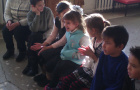 Дети летели и видели созвездие именинников, к которому направлялись. Дети открыли глаза и увидели звёздочку «Знакомство», жители этой звёздочки очень гостеприимны и доброжелательны и были рады познакомиться. Дети дружно и громко назвали свои имена. Было предложено поиграть в игру «Размотало-замотало». На размотало все встают кругом, на замотало, сходятся в центр круга и обнимаются.