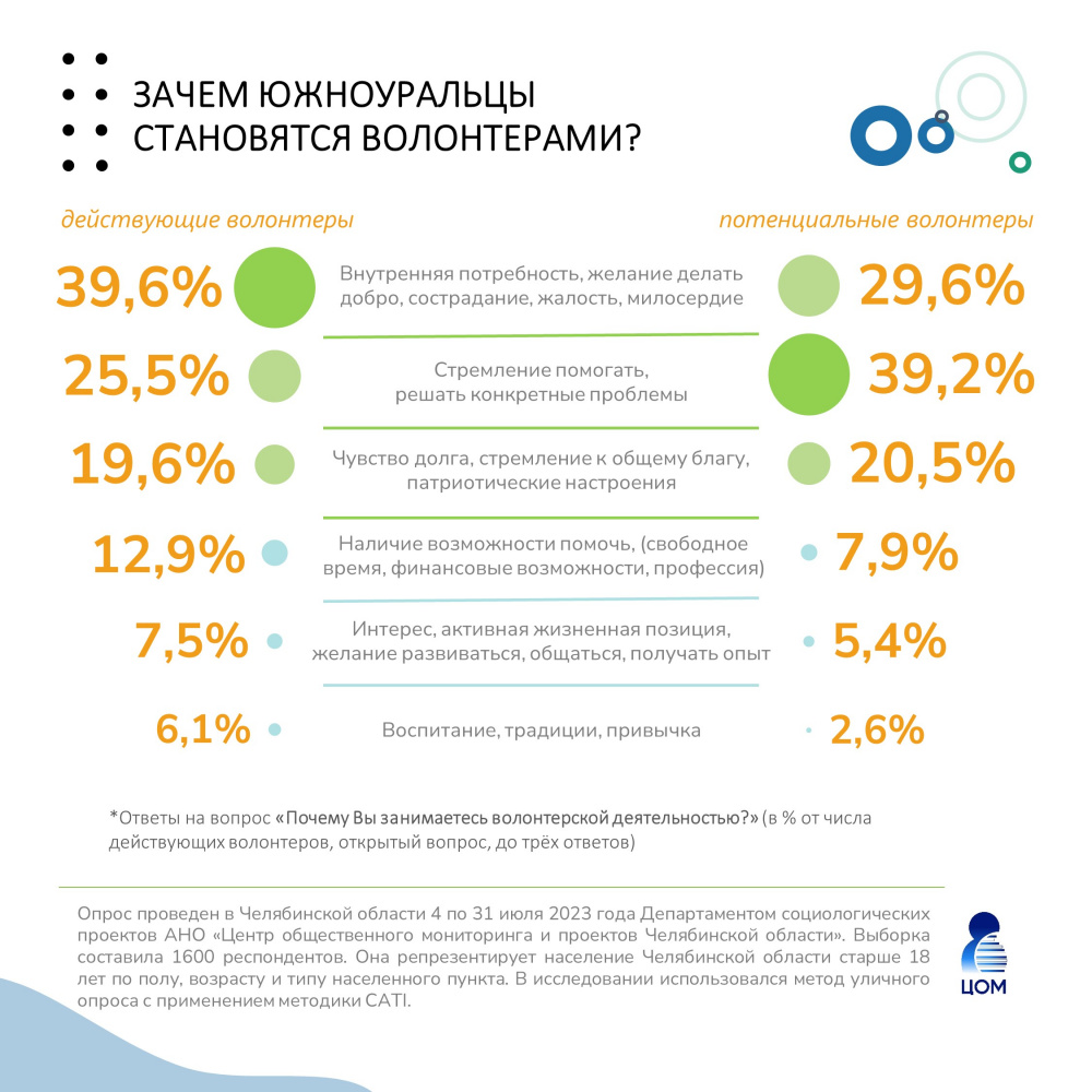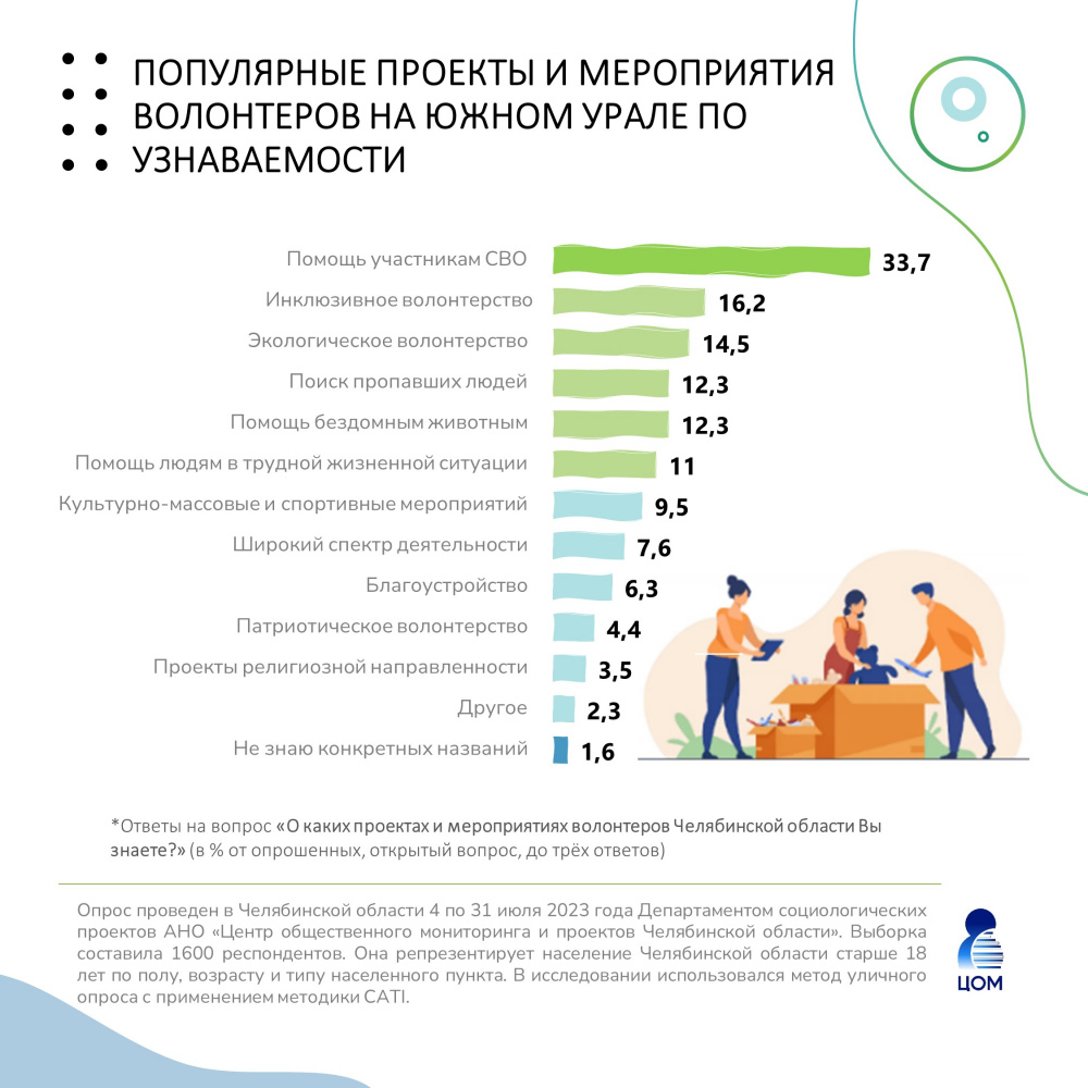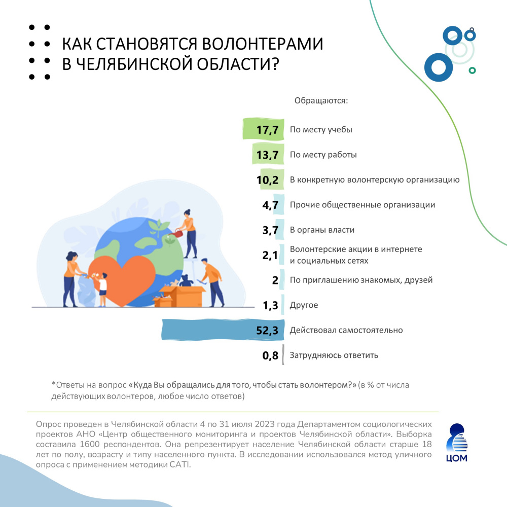 «Среди действующих волонтеров региона существенно больше женщин среднего возраста, работников бюджетной сферы, узнавших о волонтерстве на работе, знающих о волонтерской помощи бездомным животным, об инклюзивном и экологическом волонтерстве, о платформе DOBRO.RU, Челябинском ресурсном центре поддержки добровольчества, конкретных проектах волонтеров региона», — рассказывают после анализа ответов в Центре общественного мониторинга и проектов Челябинской области.