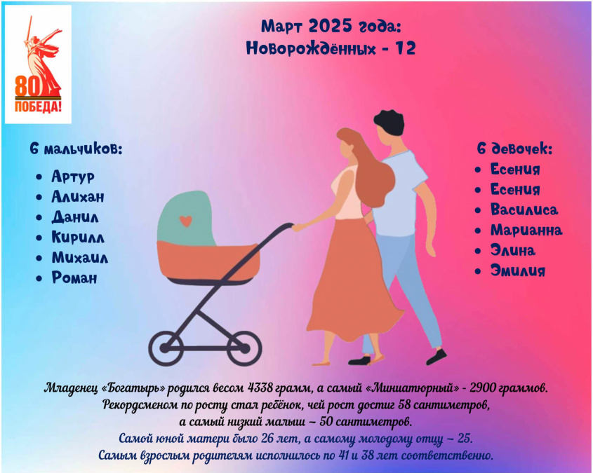 С 1 по 31 марта в районе появилось на свет двенадцать малышей: шесть мальчиков и шесть девочек. Счастливые родители выбрали для своих сыновей имена Артур, Алихан, Данил, Кирилл, Михаил и Роман, а для дочек — Есения-2, Василиса, Марианна, Элина и Эмилия.
