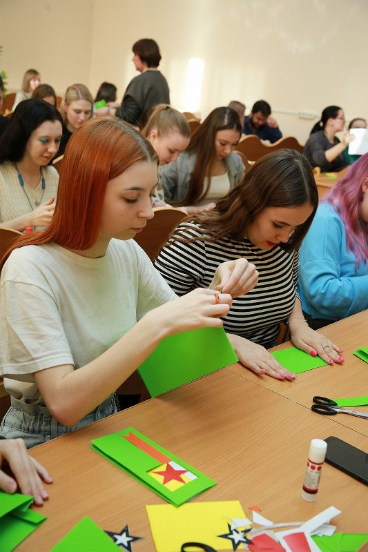 В рамках акции педагог кафедры технологии и психолого-педагогических дисциплин Маргарита Семина провела мастер-класс по изготовлению открытки. Акцент был сделан на то, что многие студенты выходят на практику в школы, где могут применить данную технику и вместе с учениками сделать такие же открытки для солдат, которые непосредственно участвует в боевых действиях, и для родных – пап, дедушек, братьев.