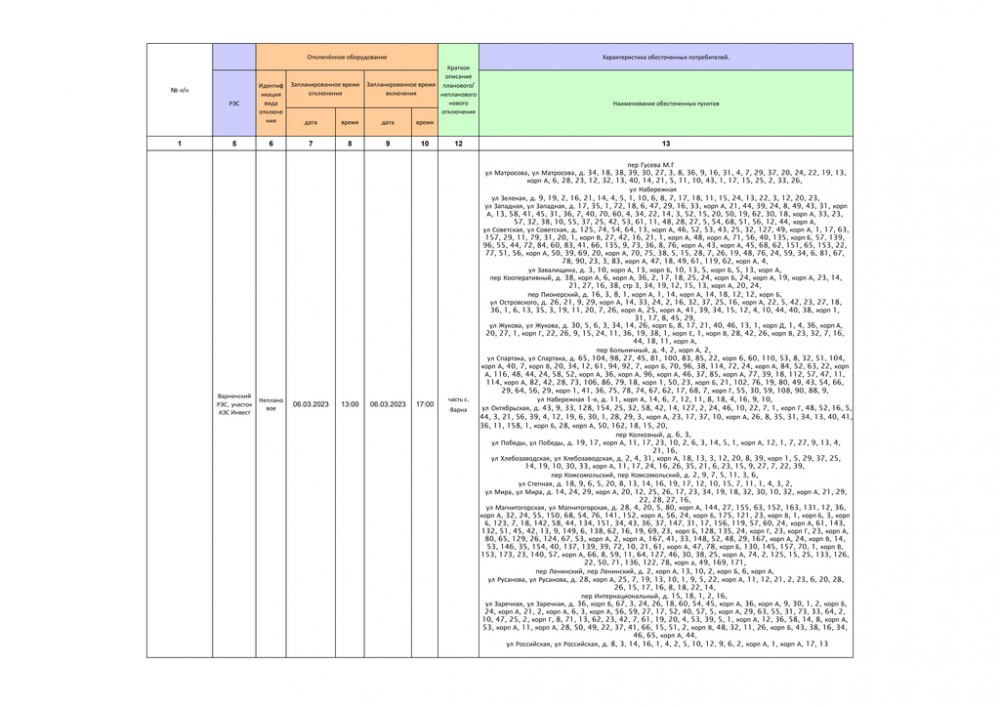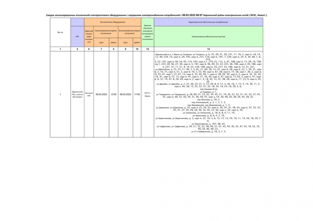 Сводка запланированных отключений электросетевого оборудования с перерывом электроснабжения потребителей с 06.03.2023 Варненский район электрических сетей (ВРЭС, Инвест)