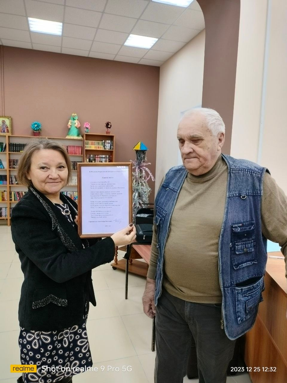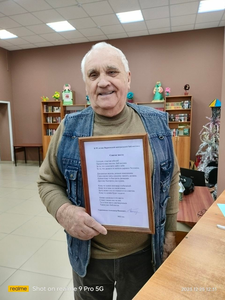 Герасименко Александр Иванович подарил к 95-летию Варненской центральной библиотеке стихотворение собственного сочинения "Святое место". Очень приятно читать такие светлые добрые слова!