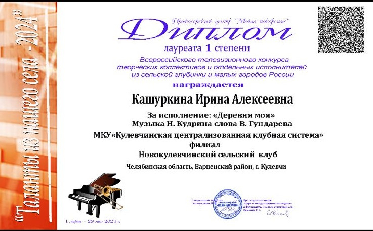 Кашуркина Ирина Алексеевна-заведующая Новокулевчинским сельским клубом-филиалом, в режиме онлайн приняла участие в Всероссийском телевизионном конкурсе «Таланты из нашего села-2024». За исполнение песни «Деревня моя» она награждена Дипломом Лауреата I степени.