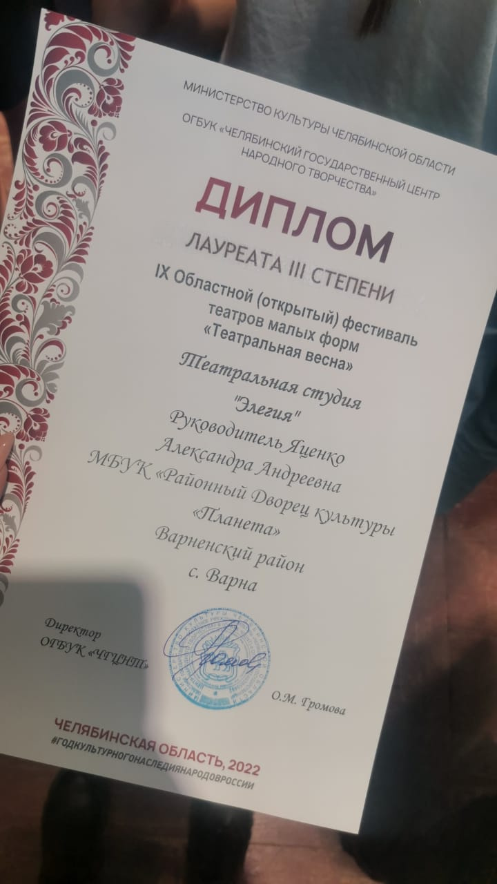 17 апреля артисты студии «Элегия» при Дворце культуры «Планета» приняли участие в IX Областном (открытом) фестивале театров малых форм "Театральная весна" в с. Чесма.