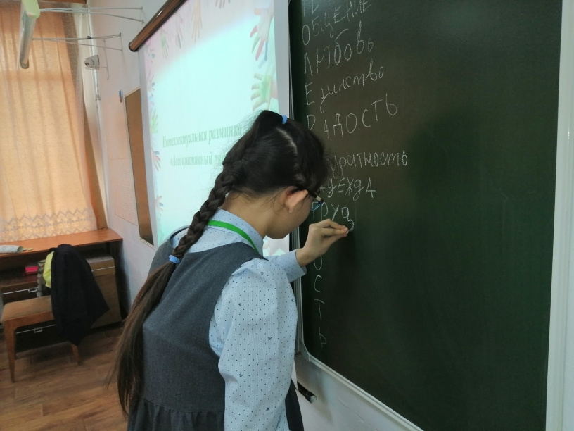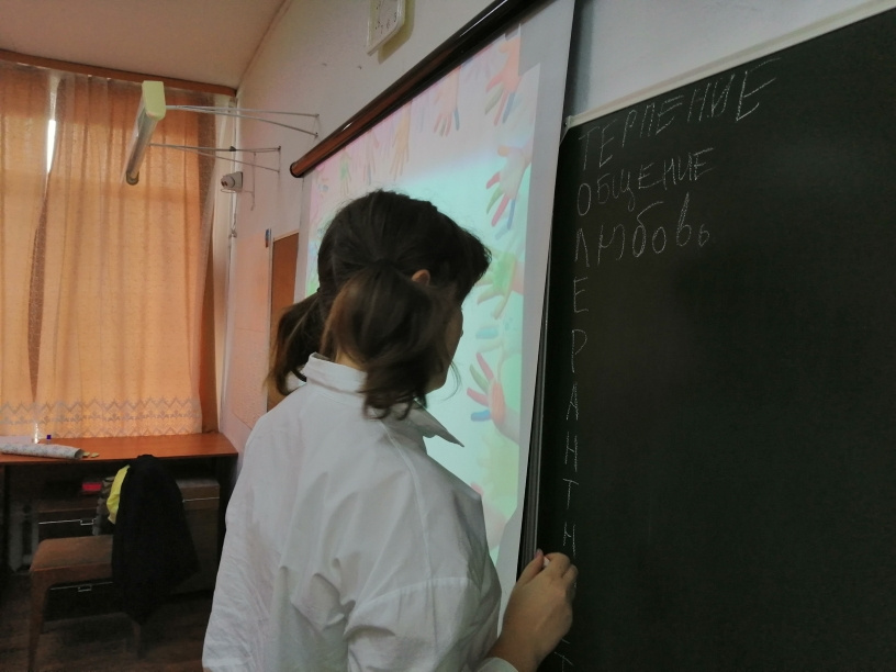 Урок начался с рассказа ведущей об истории праздника и почему он сегодня очень актуален. Ребята также были ознакомлены с понятием толерантности и основными чертами, присущими толерантному человеку, узнали значение этого слова в разных странах мира. После этого подростки по очереди садились на волшебный стул и узнавали о себе много хорошего от своих одноклассников. Это им очень понравилось, комплименты в их адрес звучали самые неожиданные.
