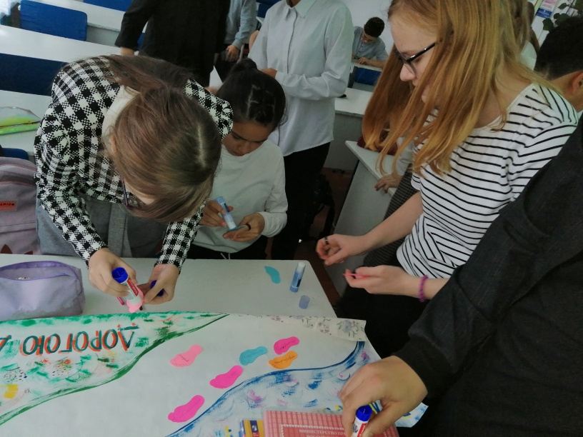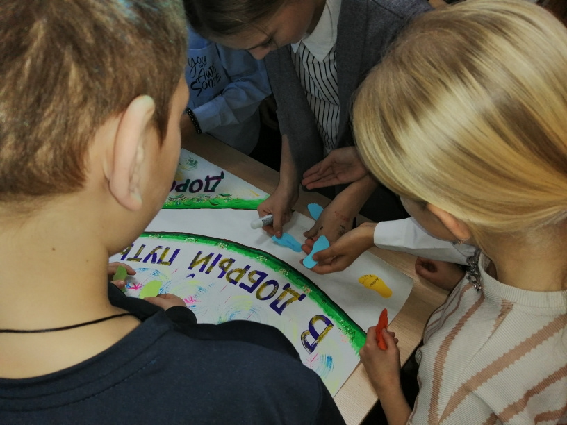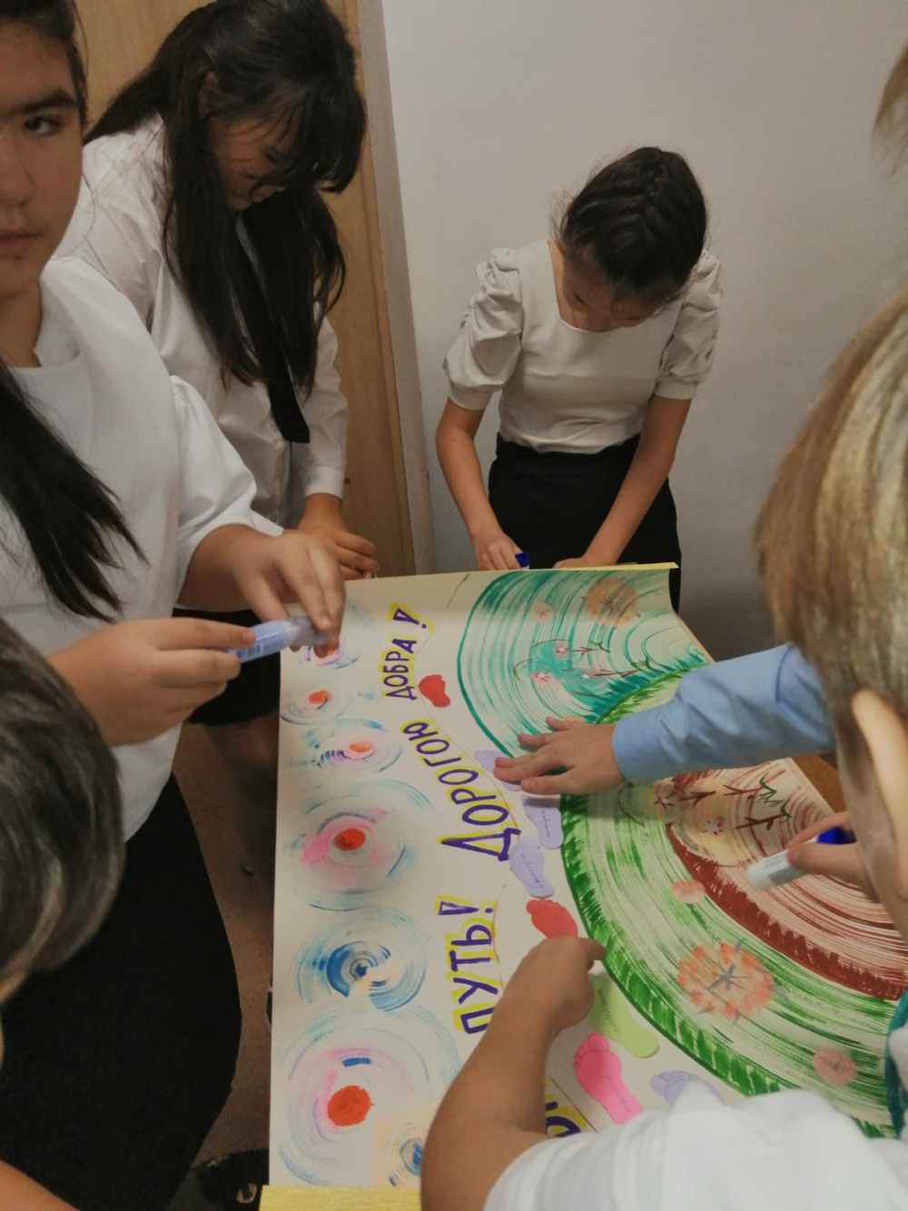 А затем учащиеся смогли проверить, насколько они толерантны, выполнив небольшой тест и сделав соответствующие выводы. Очень понравилось детям творческая работа «В добрый путь! Дорогою добра!», где им было предложены карточки-следы из цветной бумаги. Здесь было необходимо ученику выбрать два качества, которые являются сильными сторонами его характера, то есть положительные качества, и разместить на плакате – тропинке, символе «Дороги добра – дороги толерантности».