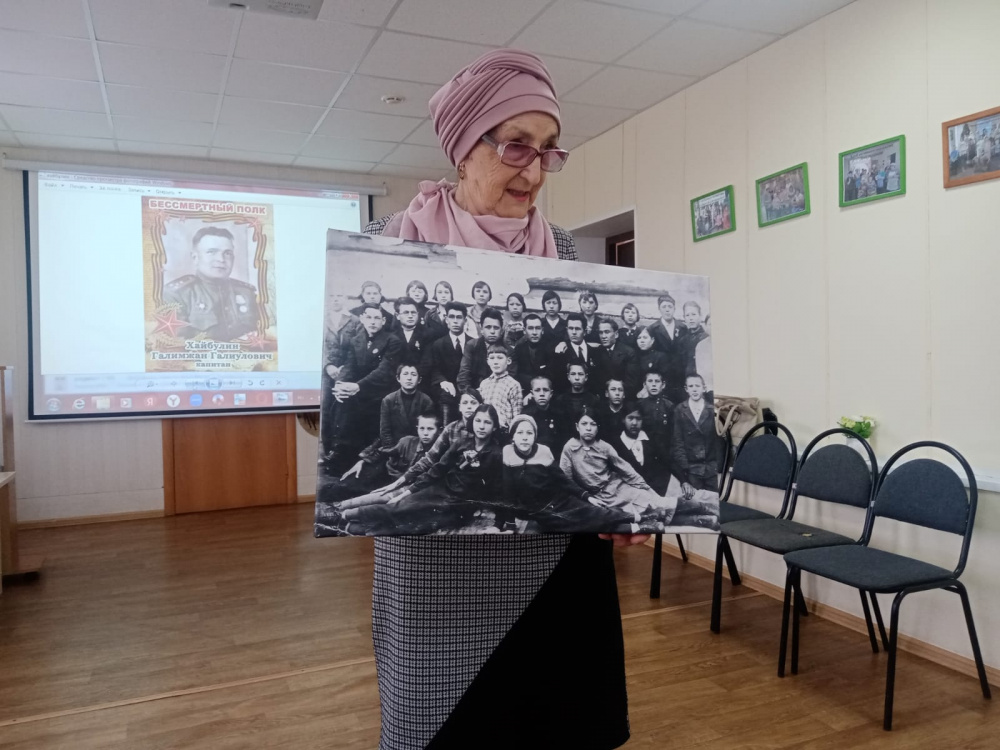 Якупова Зиля Мухтаровна представила участникам встречи фотографию выпускников татарской школы, которые практически все отправились добровольцами на фронт в первые дни войны. Большая часть из них не вернулась, сложив свои головы на поле боя. Она поделилась воспоминаниями свой мамы, которая помнит, как началась война, как всем селом помогали нашим солдатам в тылу, собирали помощь, деньги на строительство танков.