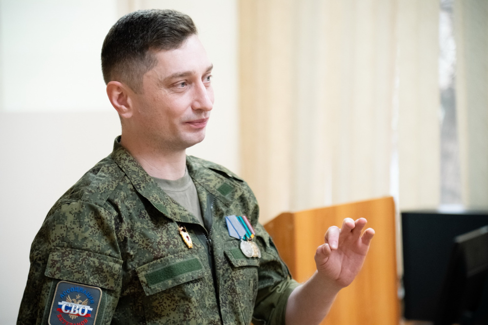 Александр Заозеров поделился со студентами своими личными историями – о том, как принял решение участвовать в специальной военной операции, о сложностях и подвигах, с которыми ему и его товарищам довелось столкнуться на фронте. Особое внимание ветеран СВО уделил разговору о долге, ответственности и патриотизме, а также об уважении к истории и памяти героев.
