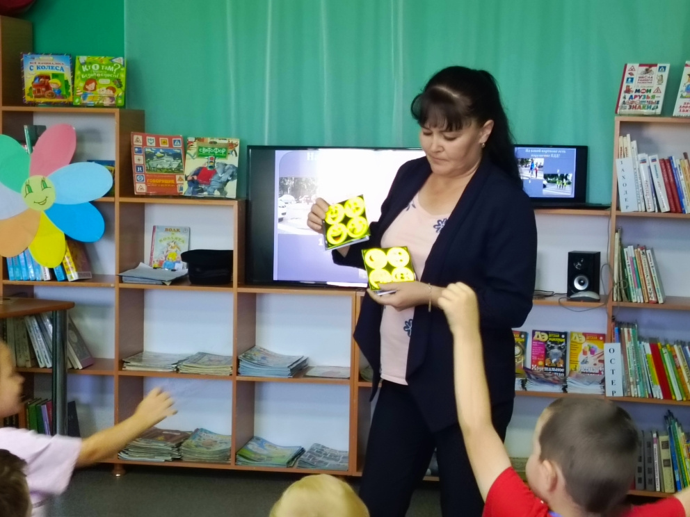 В конце встречи библиотекарь передала ребятам подарок от Феи Светофорных наук за знания правил дорожного движения – фликеры (светоотражающие смайлики).