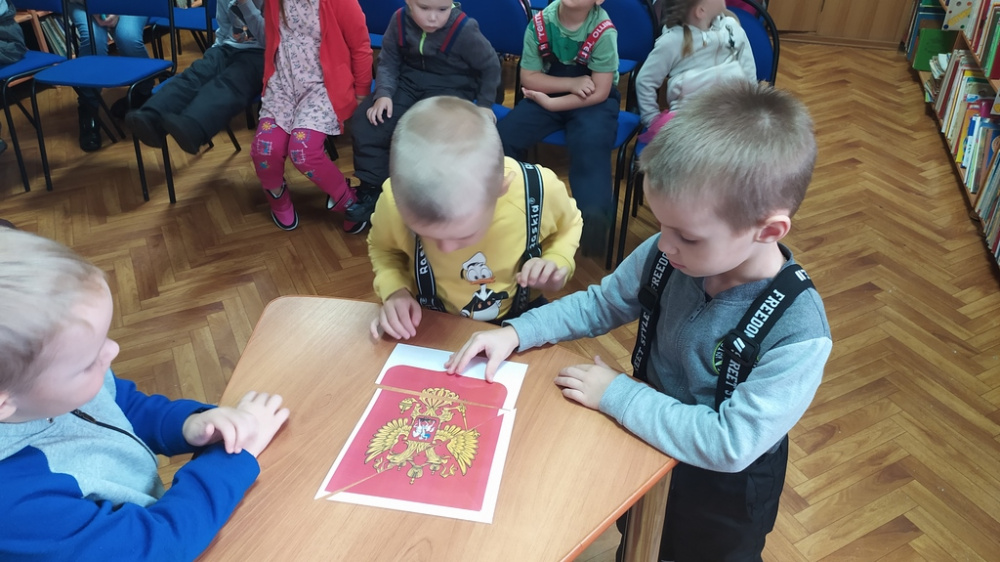 Также в ходе мероприятия дети вспомнили главные символы нашей Родины (гимн, флаг, герб). Отгадывали загадки о цветах флага, собирали пазлы «Герб РФ», с удовольствием принимали участие в русской народной игре «Лапаточки» и осетинской игре «Надень папаху».