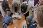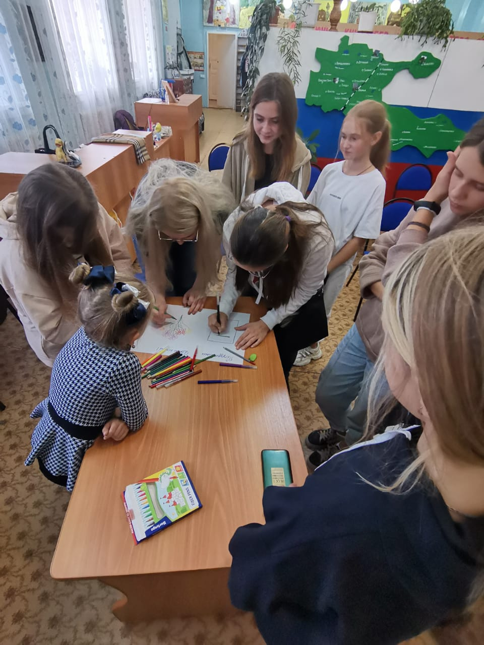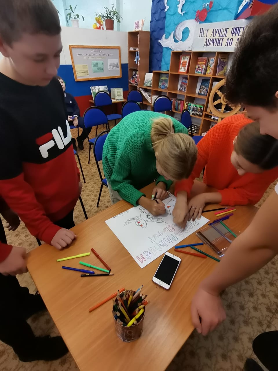Был проведен обзор у книжной выставки. В конце мероприятия были нарисованы коллективные открытки-поздравления для сотрудников почты.