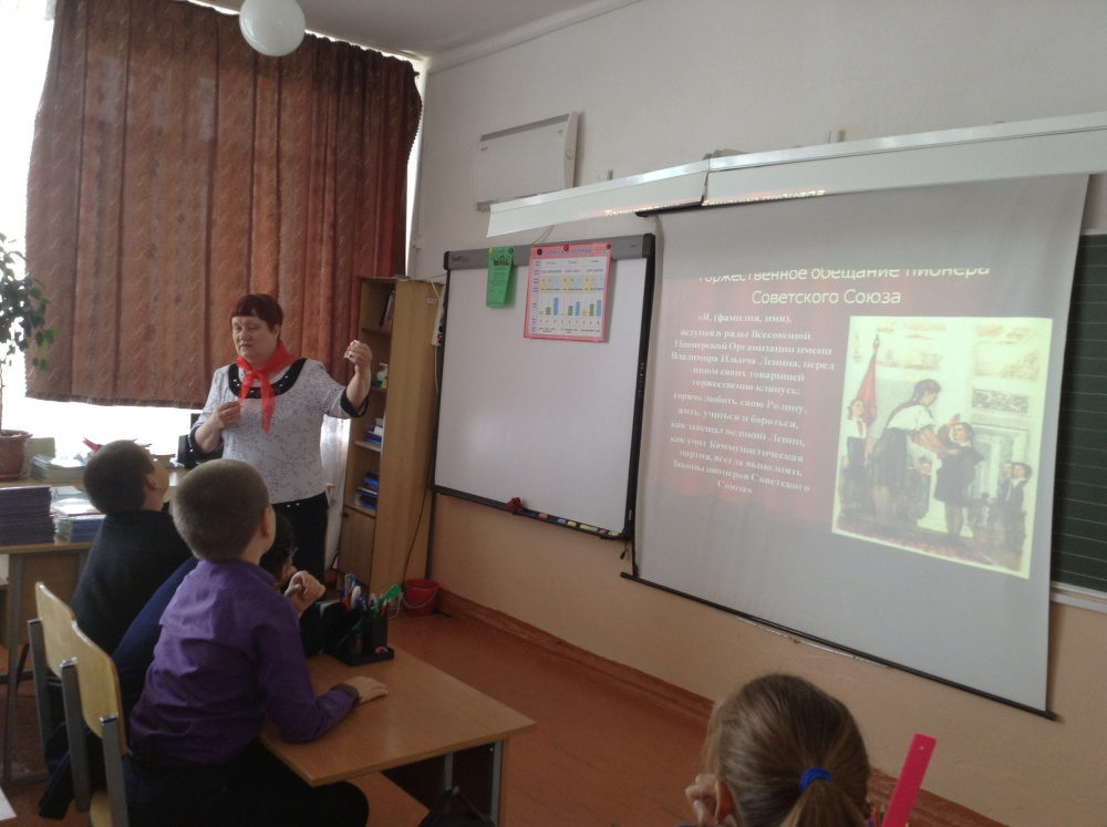 В ходе урока дети узнали о создании первых пионерских отрядов, о пионерских атрибутах: пионерском знамени, барабане, горне, пионерском галстуке, на нем присутствовали пионеры 60-х и 70-х годов, которые поделились своими воспоминаниями о пионерской жизни.