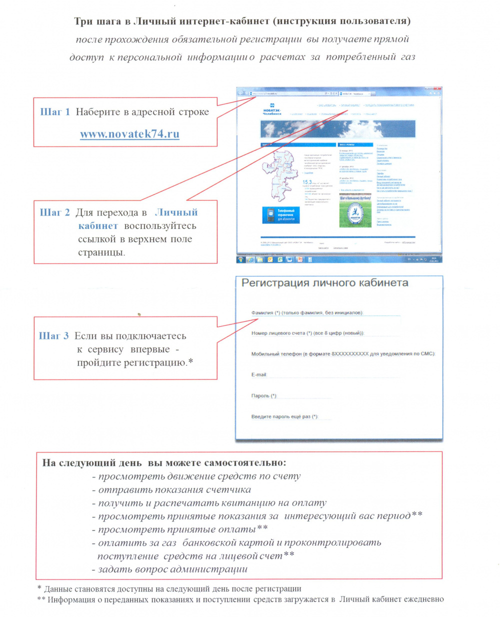 - если вы подключаетесь к сервису впервые - нужно пройти регистрацию. На следующий день после этого все данные будут доступны. В том числе - просмотр движения средств по счету, принятие оплаты и показаний за интересующий период, отправка показания счетчика, получение квитанции, которую можно распечатать, оплата за газ банковской картой и контроль поступления средств на лицевой счет.