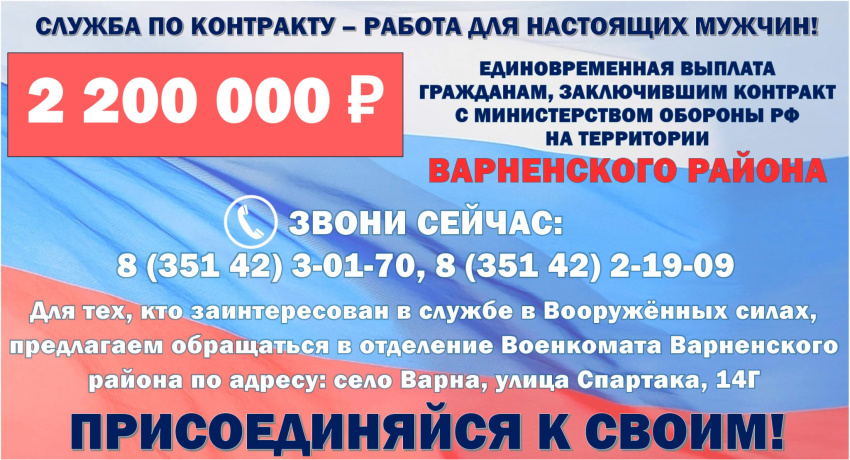 Администрация Варненского муниципального района информирует: на территории Варненского муниципального района единовременная выплата гражданам, заключившим контракт с Министерством обороны РФ о прохождении военной службы в Вооруженных силах РФ для участия в специальной военной операции и направленным для прохождения военной службы Варненским муниципальным районом с 26 июня 2025 года составляет 2 миллиона 200 тысяч рублей: 1 миллион 500 тысяч рублей – региональный бюджет, 400 тысяч рублей – федеральный, 300 тысяч рублей – средства местного бюджета.