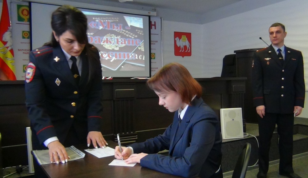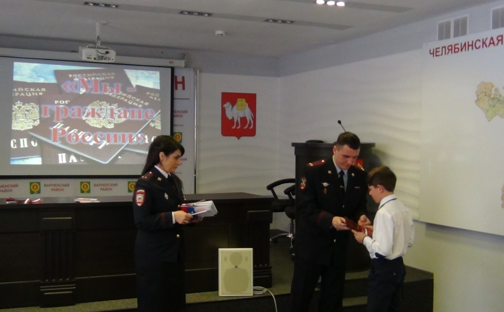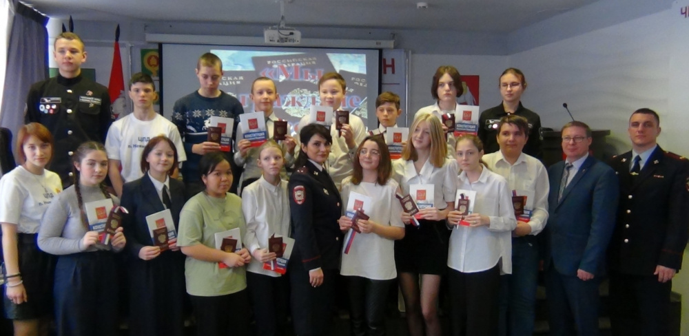 Главный документ юным гражданам вручили вместе с книгой с текстом Конституции Российской Федерации заместитель начальник отдела подполковник внутренней службы Николай Рыбаков и временно исполняющая обязанности начальника отделения по вопросам миграции лейтенант полиции Надежда Фролова.
