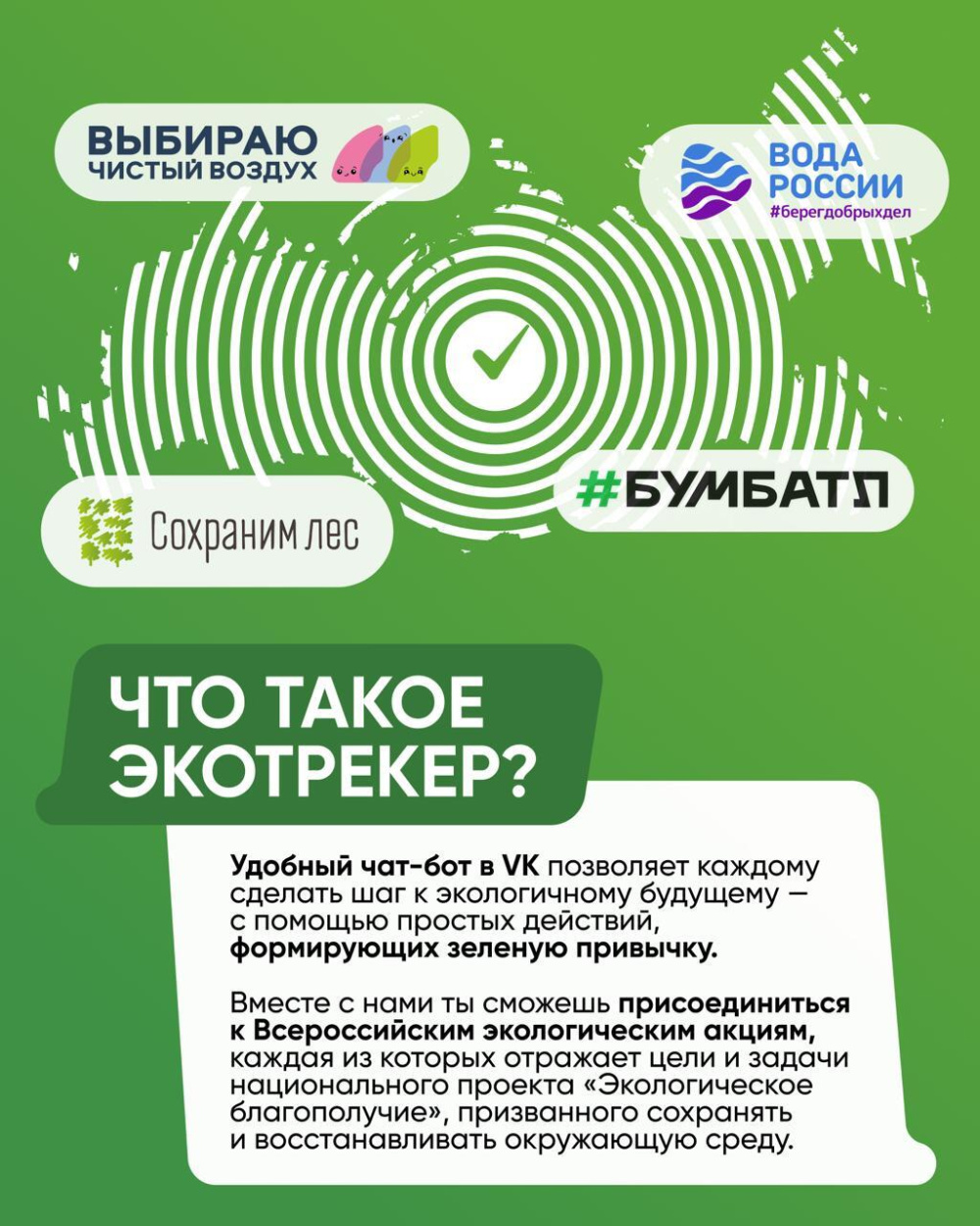 👋Удобный чат-бот во «ВКонтакте» поможет сделать шаг к экологичному будущему. С его помощью можно легко внедрить в повседневную жизнь полезные привычки и присоединиться к всероссийским экологическим акциям: