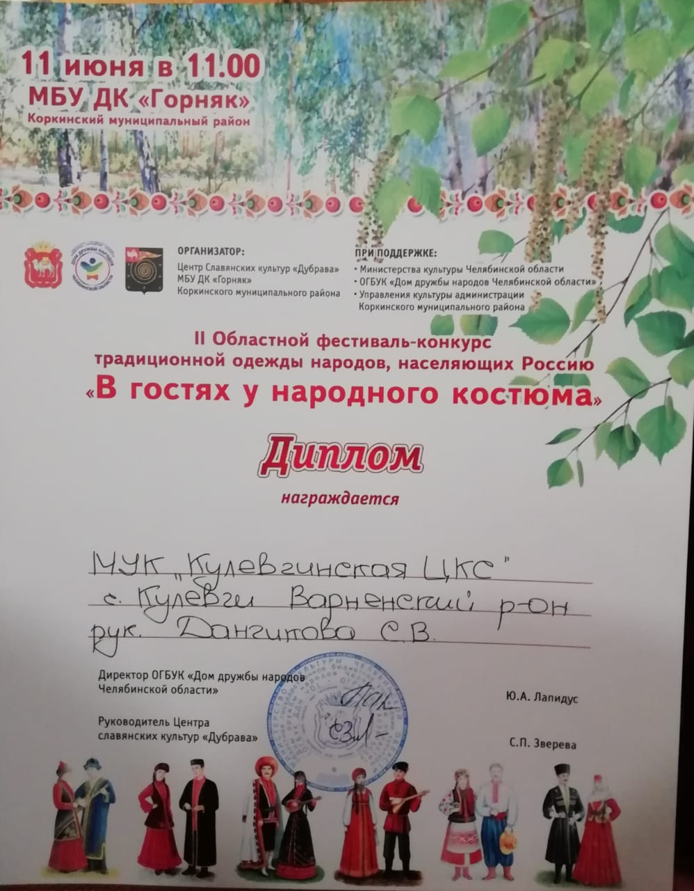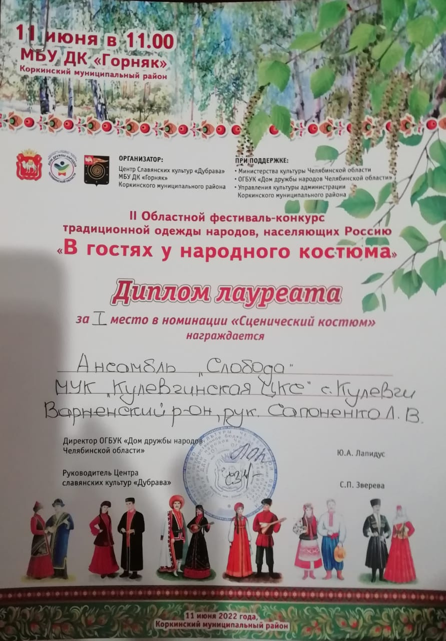 Ансамбль «Слобода» Кулевчинского Дома культуры принял участие во II областном фестивале конкурсе «В гостях у народного костюма». На конкурсе представляли мордовскую культуру. В нашем исполнении прозвучала мордовская народная песня «Луганяса келуне» («На лугу берёзка»). В номинации сценический костюм ансамбль «Слобода» стал Лауреатом I степени. Сценические костюмы пошили наши местные мастерицы Бабина Л.В., Данчинова С.В., Шешминцева И.В. Так же была предоставлена выставочная композиция «Ламбама чайда симма карматам! Мази мокша мора моратам! («Сладкий чай будем пить! Красивые песни мордовские споём!» - Куклы из капрона, ситца, наполнитель «холафайбер». Плетёная мебель из бумажной лозы. - руководитель композиции Данчинова С.В. - была отмечена дипломом.