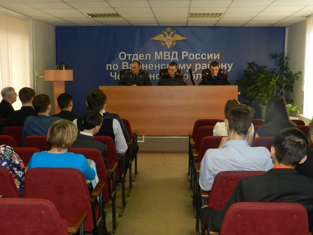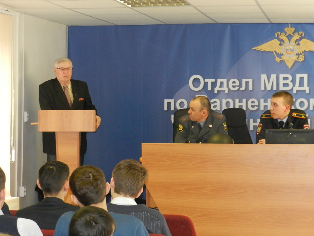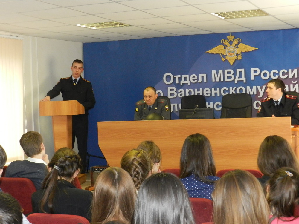 Затем в актовом зале сотрудники полиции рассказали школьникам о своей службе в органах внутренних дел, об основных направлениях деятельности полиции, порядке приема и прохождении службы в органах внутренних дел, правах и обязанностях полицейских, а также о социальных гарантиях сотрудников ОВД. Алексей Катрюк поделился своими воспоминаниями о службе в боевых точках Чеченской Республики. Виктор Иванович Артемьев рассказал о фронтовиках Великой Отечественной войны, служивших в Варненском РОВД, о своей работе в милиции, приводя примеры борьбы с преступностью.