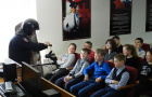 Инспектор направления профессиональной подготовки лейтенант внутренней службы Максим Минаков рассказал об использовании средств индивидуальной самозащиты, продемонстрировал образцы вооружения и специальных средств, состоящие на вооружении в полиции: бронежилет, защитный шлем, пистолет Макарова, автомат Калашникова. Каждому из ребят представилась возможность не только рассмотреть спецсредства, но и подержать их в руках, примерить на себе бронежилет и каску, что вызвало у детей массу эмоций. Продолжилась экскурсия во дворе отдела, ребятам были показаны служебные собаки и автомашина для перевозки задержанных.